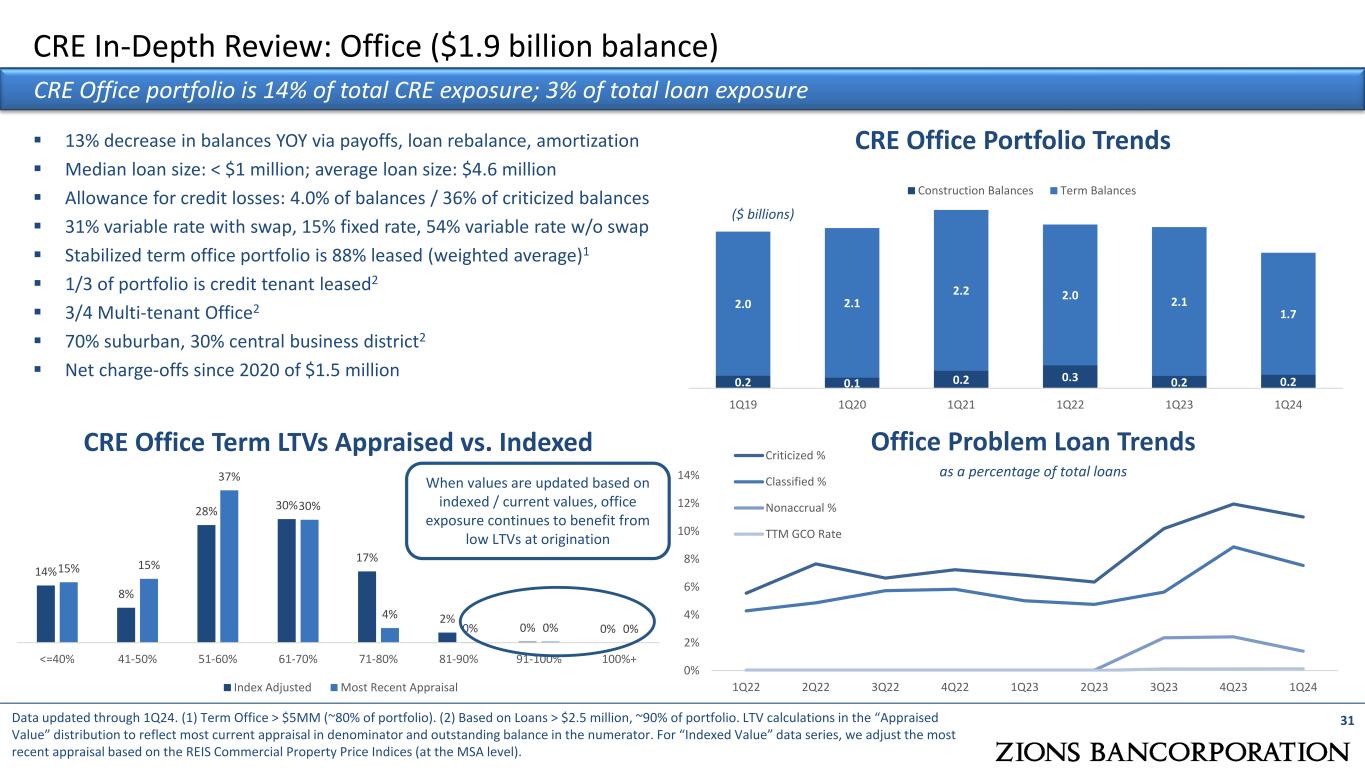 Disciplined Commercial Real Estate Growth Commercial real estate loan growth lags peers due to continued exercise of concentration risk discipline Data as of December 31, 2023; peer growth rates are normalized for significant acquisitions 0 50 100 150 200 250 300 350 1Q 15 2Q 16 3Q 17 4Q 18 1Q 20 2Q 21 3Q 22 4Q 23 ZION Peer Top Quartile Peer Bottom Quartile Indexed: 1Q15 = 100 Commercial Real Estate Excluding Owner Occupied 30 Zions has exercised caution in CRE concentrations for more than a decade and in underwriting standards for many decades.  Key factors for consideration in credit risk within CRE  Measured and disciplined growth compared to peers  Significant borrower equity – conservative LTVs  Disciplined underwriting on debt service coverage  Diversified by geography and asset class  Limited exposure to land