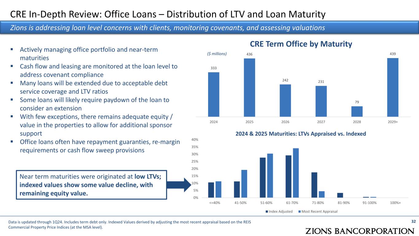 14% 8% 28% 30% 17% 2% 0% 0% 15% 15% 37% 30% 4% 0% 0% 0% <=40% 41-50% 51-60% 61-70% 71-80% 81-90% 91-100% 100%+ CRE Office Term LTVs Appraised vs. Indexed Index Adjusted Most Recent Appraisal CRE In-Depth Review: Office ($1.9 billion balance) Data updated through 1Q24. (1) Term Office > $5MM (~80% of portfolio). (2) Based on Loans > $2.5 million, ~90% of portfolio. LTV calculations in the “Appraised Value” distribution to reflect most current appraisal in denominator and outstanding balance in the numerator. For “Indexed Value” data series, we adjust the most recent appraisal based on the REIS Commercial Property Price Indices (at the MSA level). CRE Office portfolio is 14% of total CRE exposure; 3% of total loan exposure  13% decrease in balances YOY via payoffs, loan rebalance, amortization  Median loan size: < $1 million; average loan size: $4.6 million  Allowance for credit losses: 4.0% of balances / 36% of criticized balances  31% variable rate with swap, 15% fixed rate, 54% variable rate w/o swap  Stabilized term office portfolio is 88% leased (weighted average)1  1/3 of portfolio is credit tenant leased2  3/4 Multi-tenant Office2  70% suburban, 30% central business district2  Net charge-offs since 2020 of $1.5 million Office Problem Loan Trends as a percentage of total loans When values are updated based on indexed / current values, office exposure continues to benefit from low LTVs at origination ($ billions) CRE Office Portfolio Trends 0% 2% 4% 6% 8% 10% 12% 14% 1Q22 2Q22 3Q22 4Q22 1Q23 2Q23 3Q23 4Q23 1Q24 Criticized % Classified % Nonaccrual % TTM GCO Rate 31 0.2 0.1 0.2 0.3 0.2 0.2 2.0 2.1 2.2 2.0 2.1 1.7 1Q19 1Q20 1Q21 1Q22 1Q23 1Q24 Construction Balances Term Balances