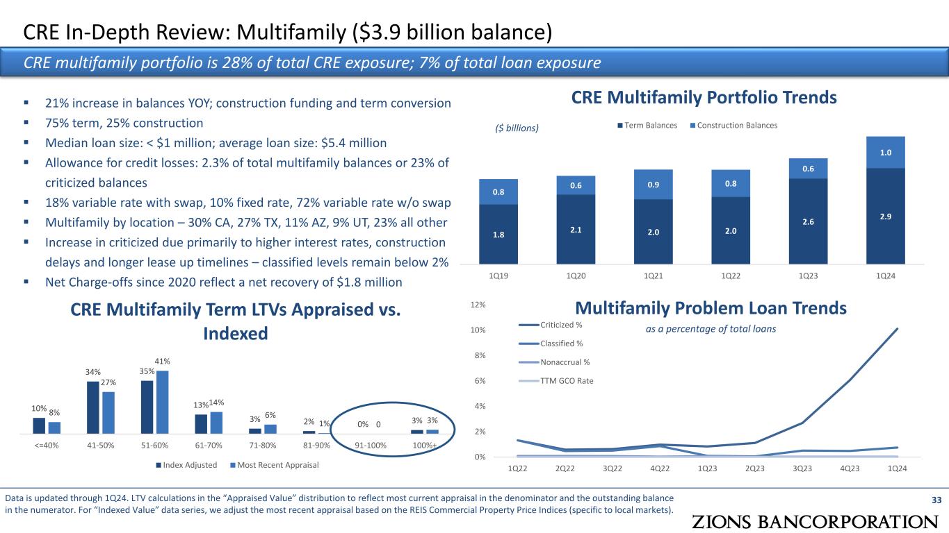 CRE In-Depth Review: Office Loans – Distribution of LTV and Loan Maturity Zions is addressing loan level concerns with clients, monitoring covenants, and assessing valuations  Actively managing office portfolio and near-term maturities  Cash flow and leasing are monitored at the loan level to address covenant compliance  Many loans will be extended due to acceptable debt service coverage and LTV ratios  Some loans will likely require paydown of the loan to consider an extension  With few exceptions, there remains adequate equity / value in the properties to allow for additional sponsor support  Office loans often have repayment guaranties, re-margin requirements or cash flow sweep provisions CRE Term Office by Maturity Near term maturities were originated at low LTVs; indexed values show some value decline, with remaining equity value. 32Data is updated through 1Q24. Includes term debt only. Indexed Values derived by adjusting the most recent appraisal based on the REIS Commercial Property Price Indices (at the MSA level). ($ millions) 333 436 242 231 79 439 2024 2025 2026 2027 2028 2029+ 0% 5% 10% 15% 20% 25% 30% 35% 40% <=40% 41-50% 51-60% 61-70% 71-80% 81-90% 91-100% 100%+ 2024 & 2025 Maturities: LTVs Appraised vs. Indexed Index Adjusted Most Recent Appraisal