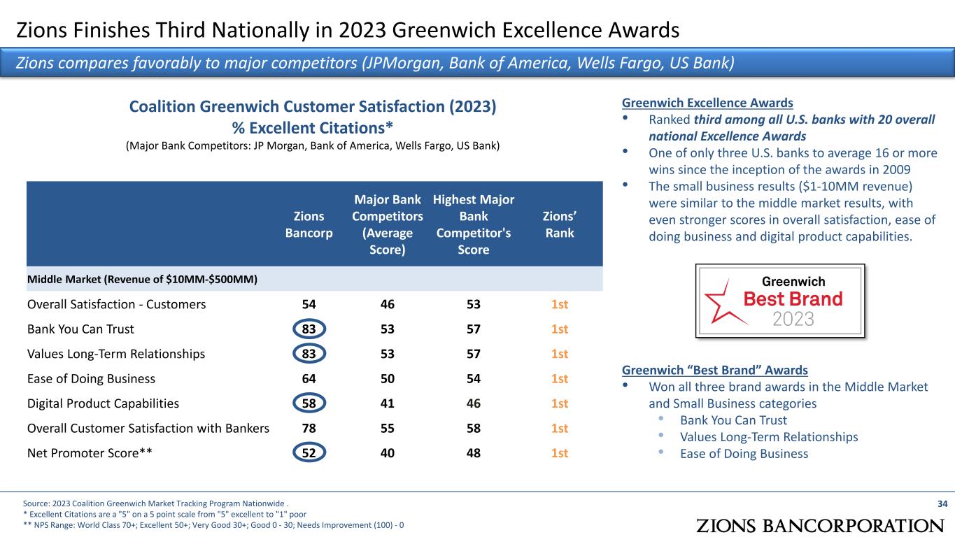 34 Zions Finishes Third Nationally in 2023 Greenwich Excellence Awards Zions compares favorably to major competitors (JPMorgan, Bank of America, Wells Fargo, US Bank) Zions Bancorp Major Bank Competitors (Average Score) Highest Major Bank Competitor's Score Zions’ Rank Middle Market (Revenue of $10MM-$500MM) Overall Satisfaction - Customers 54 46 53 1st Bank You Can Trust 83 53 57 1st Values Long-Term Relationships 83 53 57 1st Ease of Doing Business 64 50 54 1st Digital Product Capabilities 58 41 46 1st Overall Customer Satisfaction with Bankers 78 55 58 1st Net Promoter Score** 52 40 48 1st Source: 2023 Coalition Greenwich Market Tracking Program Nationwide . * Excellent Citations are a "5" on a 5 point scale from "5" excellent to "1" poor ** NPS Range: World Class 70+; Excellent 50+; Very Good 30+; Good 0 - 30; Needs Improvement (100) - 0 Coalition Greenwich Customer Satisfaction (2023) % Excellent Citations* (Major Bank Competitors: JP Morgan, Bank of America, Wells Fargo, US Bank) Greenwich Excellence Awards • Ranked third among all U.S. banks with 20 overall national Excellence Awards • One of only three U.S. banks to average 16 or more wins since the inception of the awards in 2009 • The small business results ($1-10MM revenue) were similar to the middle market results, with even stronger scores in overall satisfaction, ease of doing business and digital product capabilities. Greenwich “Best Brand” Awards • Won all three brand awards in the Middle Market and Small Business categories • Bank You Can Trust • Values Long-Term Relationships • Ease of Doing Business