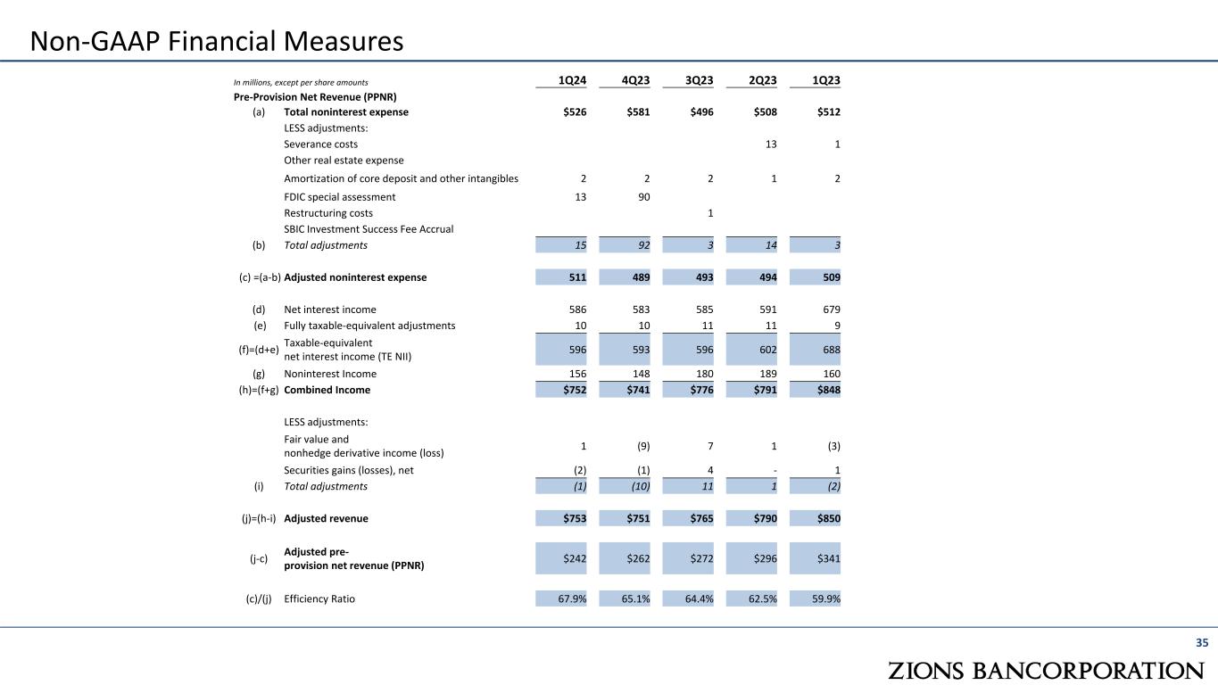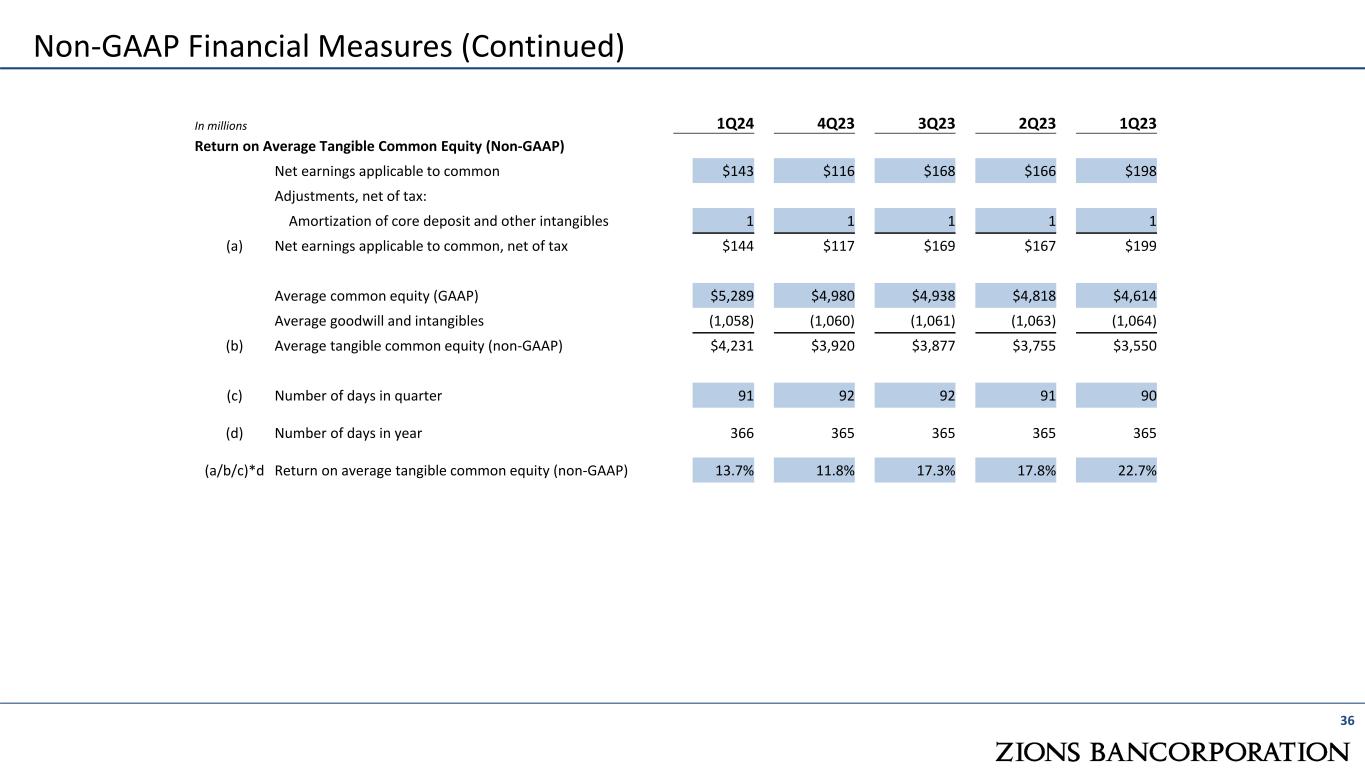 35 Non-GAAP Financial Measures In millions, except per share amounts 1Q24 4Q23 3Q23 2Q23 1Q23 Pre-Provision Net Revenue (PPNR) (a) Total noninterest expense $526 $581 $496 $508 $512 LESS adjustments: Severance costs 13 1 Other real estate expense Amortization of core deposit and other intangibles 2 2 2 1 2 FDIC special assessment 13 90 Restructuring costs 1 SBIC Investment Success Fee Accrual (b) Total adjustments 15 92 3 14 3 (c) =(a-b) Adjusted noninterest expense 511 489 493 494 509 (d) Net interest income 586 583 585 591 679 (e) Fully taxable-equivalent adjustments 10 10 11 11 9 (f)=(d+e) Taxable-equivalent net interest income (TE NII) 596 593 596 602 688 (g) Noninterest Income 156 148 180 189 160 (h)=(f+g) Combined Income $752 $741 $776 $791 $848 LESS adjustments: Fair value and nonhedge derivative income (loss) 1 (9) 7 1 (3) Securities gains (losses), net (2) (1) 4 - 1 (i) Total adjustments (1) (10) 11 1 (2) (j)=(h-i) Adjusted revenue $753 $751 $765 $790 $850 (j-c) Adjusted pre- provision net revenue (PPNR) $242 $262 $272 $296 $341 (c)/(j) Efficiency Ratio 67.9% 65.1% 64.4% 62.5% 59.9%