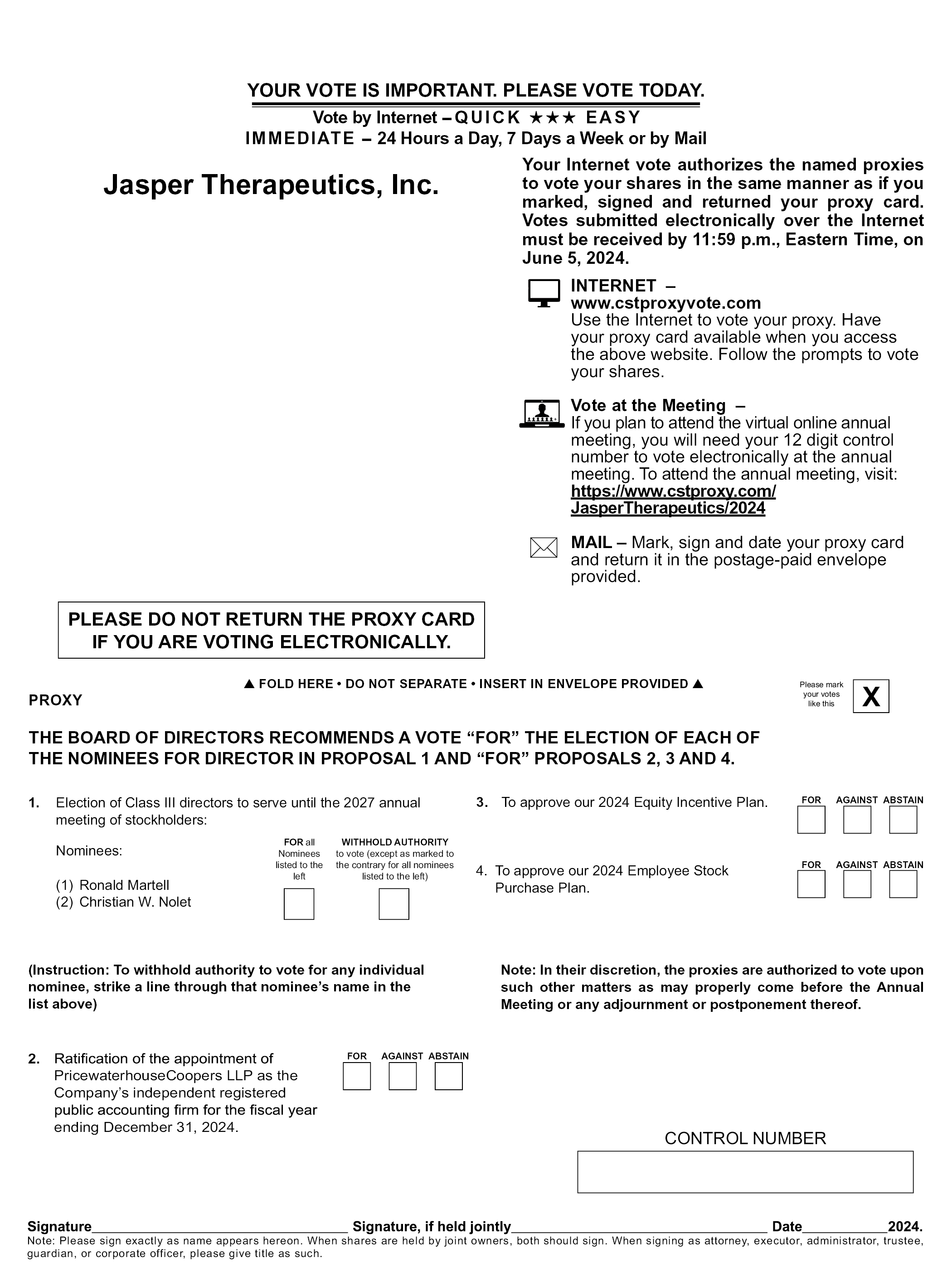 YOUR VOTE IS IMPORTANT. PLEASE VOTE TODAY. Vote by Internet - QUICK EASY IMMEDIATE - 24 Hours a Day, 7 Days a Week or by Mail Jasper Therapeutics, Inc. Your Internet vote authorizes the named proxies to vote your shares in the same manner as if you marked, signed and returned your proxy card. Votes submitted electronically over the Internet must be received by 11:59 p.m., Eastern Time, on June 5, 2024. IN-TERNET – www.cstproxyvote.com Use the Internet to vote your proxy. Have your proxy card available when you access the above website. Follow the prompts to vote your shares. Vote at the Meeting – If you plan to attend the virtual online annual meeting, you will need your 12 digit control number to vote electronically at the annual meeting. To attend the annual meeting, visit: https://www.cstproxy.com/ JasperTherapeutics/2024 MAIL – Mark, sign and date your proxy card and return it in the postage-paid envelope provided. PLEASE DO NOT RETURN THE PROXY CARD IF YOU ARE VOTING ELECTRONICALLY. FOLD HERE DO NOT SEPARATE INSERT IN ENVELOPE PROVIDED PROXYTHE BOARD OF DIRECTORS RECOMMENDS A VOTE “FOR” THE ELECTION OF EACH OF THE NOMINEES FOR DIRECTOR IN PROPOSAL 1 AND “FOR” PROPOSALS 2, 3 AND 4. 1. Election of Class III directors to serve until the 2027 annual meeting of stockholders: Nominees: (1) Ronald Martell (2) Christian W. Nolet FOR all Nominees listed to the left WITH-HOLD AUTHORITY to vote (except as marked to the contrary for all nominees listed to the left) (Instruction: To withhold authority to vote for any individual nominee, strike a line through that nominee’s name in the list above 2. Ratification of the appointment of PricewaterhouseCoopers LLP as the Company’s independent registered pub-lic accounting firm for the fiscal year ending December 31, 2024. FOR AGAINST ABSTAIN 3. To approve our 2024 Equity Incentive Plan. FOR AGAINST ABSTAIN 4. To approve our 2024 Employee Stock Purchase Plan. FOR AGAINST ABSTAIN Note: In their discretion, the proxies are authorized to vote upon such other matters as may properly come before the Annual Meeting or any adjournment or postponement thereof. CON-TROL NUMBER Signature Signature, if held jointly Date2024. Note: Please sign exactly as name appears here-on. When shares are held by joint owners, both should sign. When signing as attorney, executor, administrator, trustee, guardian, or corporate officer, please give title as such.