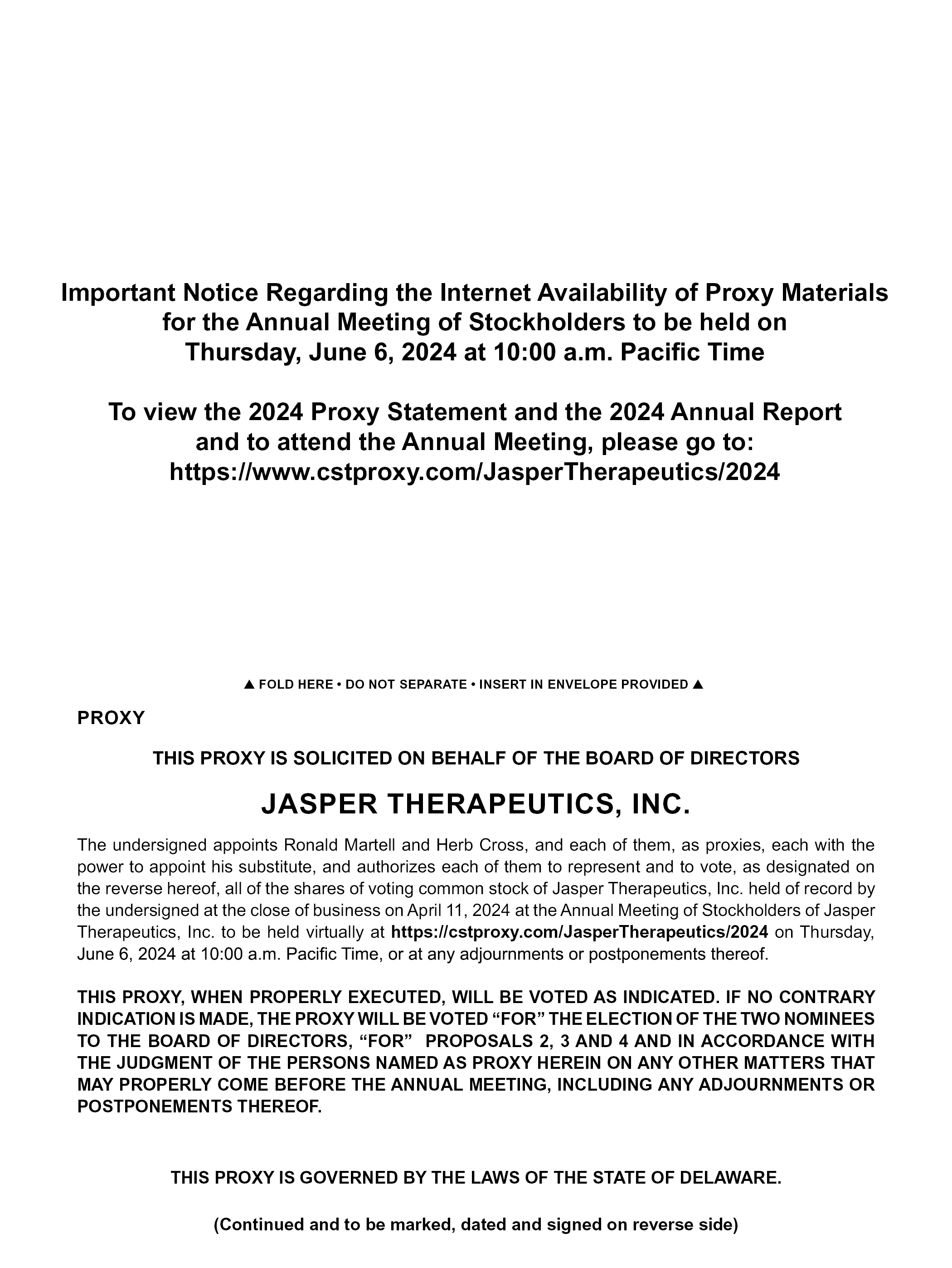 Important Notice Regarding the Internet Availability of Proxy Materials for the Annual Meeting of Stockholders to be held on Thursday, June 6, 2024 at 10:00 a.m. Pacific Time To view the 2024 Proxy Statement and the 2024 Annual Report and to attend the Annual Meeting, please go to: https://www.cstproxy.com/JasperTherapeutics/2024 FOLD HERE DO NOT SEPARATE INSERT IN ENVELOPE PROVIDED PROXY THIS PROXY IS SOLICITED ON BEHALF OF THE BOARD OF DIRECTORS JASPER THERAPEUTICS, INC. 188043 Jasper Therapeutics, Inc. Proxy Card Rev1 Back The undersigned appoints Ronald Martell and Herb Cross, and each of them, as proxies, each with the power to appoint his substitute, and authorizes each of them to represent and to vote, as designated on the reverse hereof, all of the shares of voting common stock of Jasper Therapeutics, Inc. held of record by the undersigned at the close of business on April 11, 2024 at the Annual Meeting of Stockholders of Jasper Therapeutics, Inc. to be held virtually at https://cstproxy.com/JasperTherapeutics/2024 on Thursday, June 6, 2024 at 10:00 a.m. Pacific Time, or at any adjournments or postponements thereof. THIS PROXY, WHEN PROPERLY EXECUTED, WILL BE VOTED AS INDICATED. IF NO CONTRARY INDICATION IS MADE, THE PROXY WILL BE VOTED “FOR” THE ELECTION OF THE TWO NOMINEES TO THE BOARD OF DIRECTORS, “FOR” PROPOSALS 2, 3 AND 4 AND IN ACCORDANCE WITH THE JUDGMENT OF THE PERSONS NAMED AS PROXY HEREIN ON ANY OTHER MATTERS THAT MAY PROPERLY COME BEFORE THE ANNUAL MEETING, INCLUDING ANY ADJOURNMENTS OR POSTPONEMENTS THEREOF. THIS PROXY IS GOVERNED BY THE LAWS OF THE STATE OF DELAWARE. (Continued and to be marked, dated and signed on reverse side)