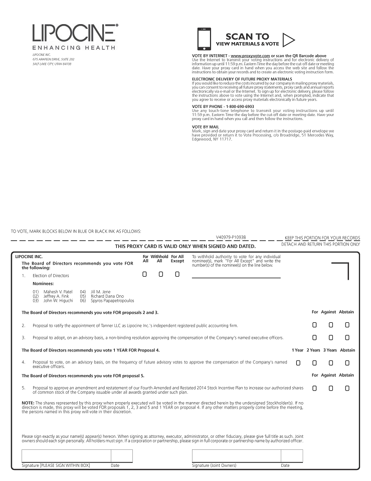 On behalf of the Board of Directors of Lipocine Inc., a Delaware corporation (“Lipocine” or the “Company”), Lipocine is pleased to deliver the accompanying Proxy Statement in connection with the annual meeting of stockholders of Lipocine (“Annual Meeting”) which will be held on June 5, 2024, at 10:00 a.m. Mountain Daylight Time, at the offices of Lipocine, located at 675 Arapeen Drive, Suite 202, Salt Lake City, Utah 84108.