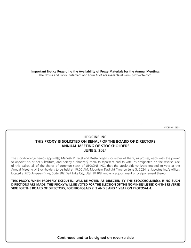 You are cordially invited to attend Lipocine Inc.’s 2024 Annual Meeting of Stockholders (the “Annual Meeting”) to be held on June 5, 2024. The meeting will be held at Lipocine’s offices located at 675 Arapeen Drive, Suite 202, Salt Lake City, Utah 84108 at 10:00 a.m. Mountain Daylight Time. The formal meeting notice and Proxy Statement for the Annual Meeting are attached.