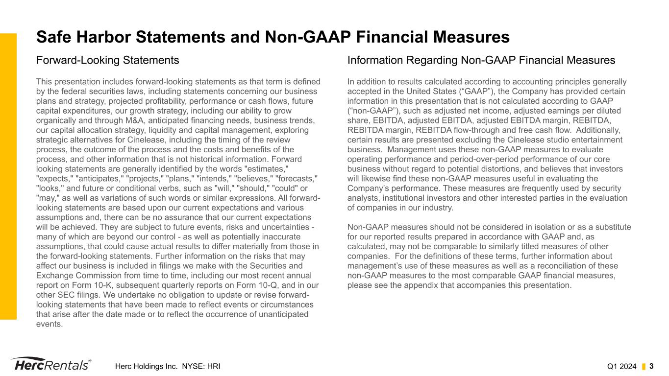 Q1 2024Herc Holdings Inc. NYSE: HRI 2 Herc Rentals Team and Agenda Agenda Safe Harbor Q1 2024 Overview Q1 Operations Review Q1 Financial Review 2024 Outlook Q&A Larry Silber President & Chief Executive Officer Aaron Birnbaum Senior Vice President & Chief Operating Officer Mark Humphrey Senior Vice President & Chief Financial Officer Leslie Hunziker Senior Vice President Investor Relations, Communications & Sustainability