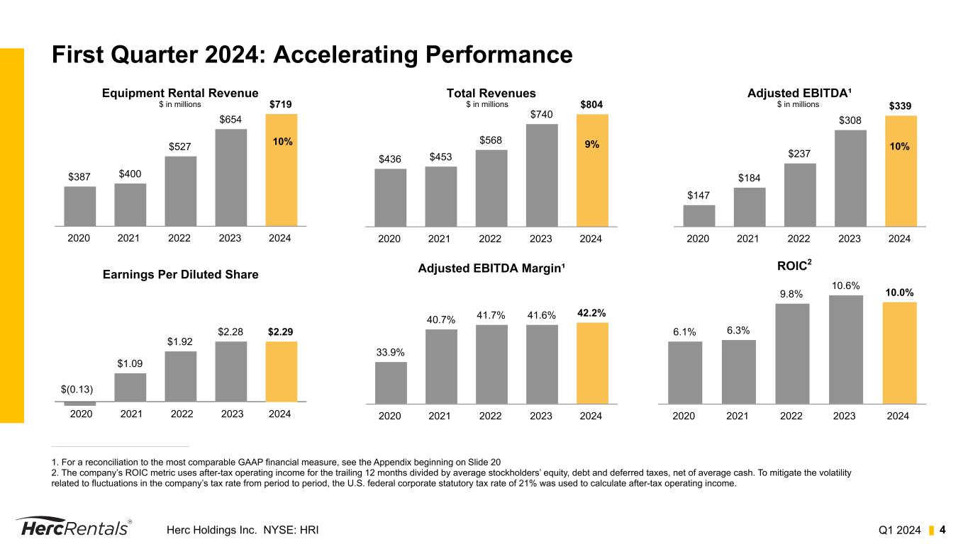 Q1 2024Herc Holdings Inc. NYSE: HRI 3 Safe Harbor Statements and Non-GAAP Financial Measures Forward-Looking Statements This presentation includes forward-looking statements as that term is defined by the federal securities laws, including statements concerning our business plans and strategy, projected profitability, performance or cash flows, future capital expenditures, our growth strategy, including our ability to grow organically and through M&A, anticipated financing needs, business trends, our capital allocation strategy, liquidity and capital management, exploring strategic alternatives for Cinelease, including the timing of the review process, the outcome of the process and the costs and benefits of the process, and other information that is not historical information. Forward looking statements are generally identified by the words "estimates," "expects," "anticipates," "projects," "plans," "intends," "believes," "forecasts," "looks," and future or conditional verbs, such as "will," "should," "could" or "may," as well as variations of such words or similar expressions. All forward- looking statements are based upon our current expectations and various assumptions and, there can be no assurance that our current expectations will be achieved. They are subject to future events, risks and uncertainties - many of which are beyond our control - as well as potentially inaccurate assumptions, that could cause actual results to differ materially from those in the forward-looking statements. Further information on the risks that may affect our business is included in filings we make with the Securities and Exchange Commission from time to time, including our most recent annual report on Form 10-K, subsequent quarterly reports on Form 10-Q, and in our other SEC filings. We undertake no obligation to update or revise forward- looking statements that have been made to reflect events or circumstances that arise after the date made or to reflect the occurrence of unanticipated events. Information Regarding Non-GAAP Financial Measures In addition to results calculated according to accounting principles generally accepted in the United States (“GAAP”), the Company has provided certain information in this presentation that is not calculated according to GAAP (“non-GAAP”), such as adjusted net income, adjusted earnings per diluted share, EBITDA, adjusted EBITDA, adjusted EBITDA margin, REBITDA, REBITDA margin, REBITDA flow-through and free cash flow. Additionally, certain results are presented excluding the Cinelease studio entertainment business. Management uses these non-GAAP measures to evaluate operating performance and period-over-period performance of our core business without regard to potential distortions, and believes that investors will likewise find these non-GAAP measures useful in evaluating the Company’s performance. These measures are frequently used by security analysts, institutional investors and other interested parties in the evaluation of companies in our industry. Non-GAAP measures should not be considered in isolation or as a substitute for our reported results prepared in accordance with GAAP and, as calculated, may not be comparable to similarly titled measures of other companies. For the definitions of these terms, further information about management’s use of these measures as well as a reconciliation of these non-GAAP measures to the most comparable GAAP financial measures, please see the appendix that accompanies this presentation.