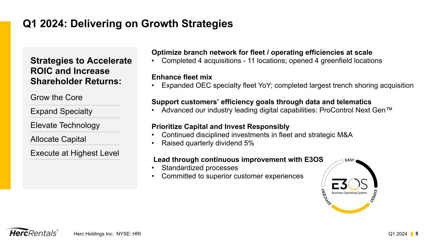 Q1 2024Herc Holdings Inc. NYSE: HRI 4 First Quarter 2024: Accelerating Performance 1. For a reconciliation to the most comparable GAAP financial measure, see the Appendix beginning on Slide 20 2. The company’s ROIC metric uses after-tax operating income for the trailing 12 months divided by average stockholders’ equity, debt and deferred taxes, net of average cash. To mitigate the volatility related to fluctuations in the company’s tax rate from period to period, the U.S. federal corporate statutory tax rate of 21% was used to calculate after-tax operating income. Equipment Rental Revenue $387 $400 $527 $654 $719 2020 2021 2022 2023 2024 10% $ in millions Total Revenues $436 $453 $568 $740 $804 2020 2021 2022 2023 2024 Adjusted EBITDA¹ $147 $184 $237 $308 $339 2020 2021 2022 2023 2024 9% 10% $ in millions $ in millions Earnings Per Diluted Share $1.09 $1.92 $2.28 $2.29 Adjusted EBITDA Margin¹ 33.9% 40.7% 41.7% 41.6% 42.2% 2020 2021 2022 2023 2024 6.1% 6.3% 9.8% 10.6% 10.0% 2020 2021 2022 2023 2024 ROIC2 2020 2021 2022 2023 2024 $(0.13)