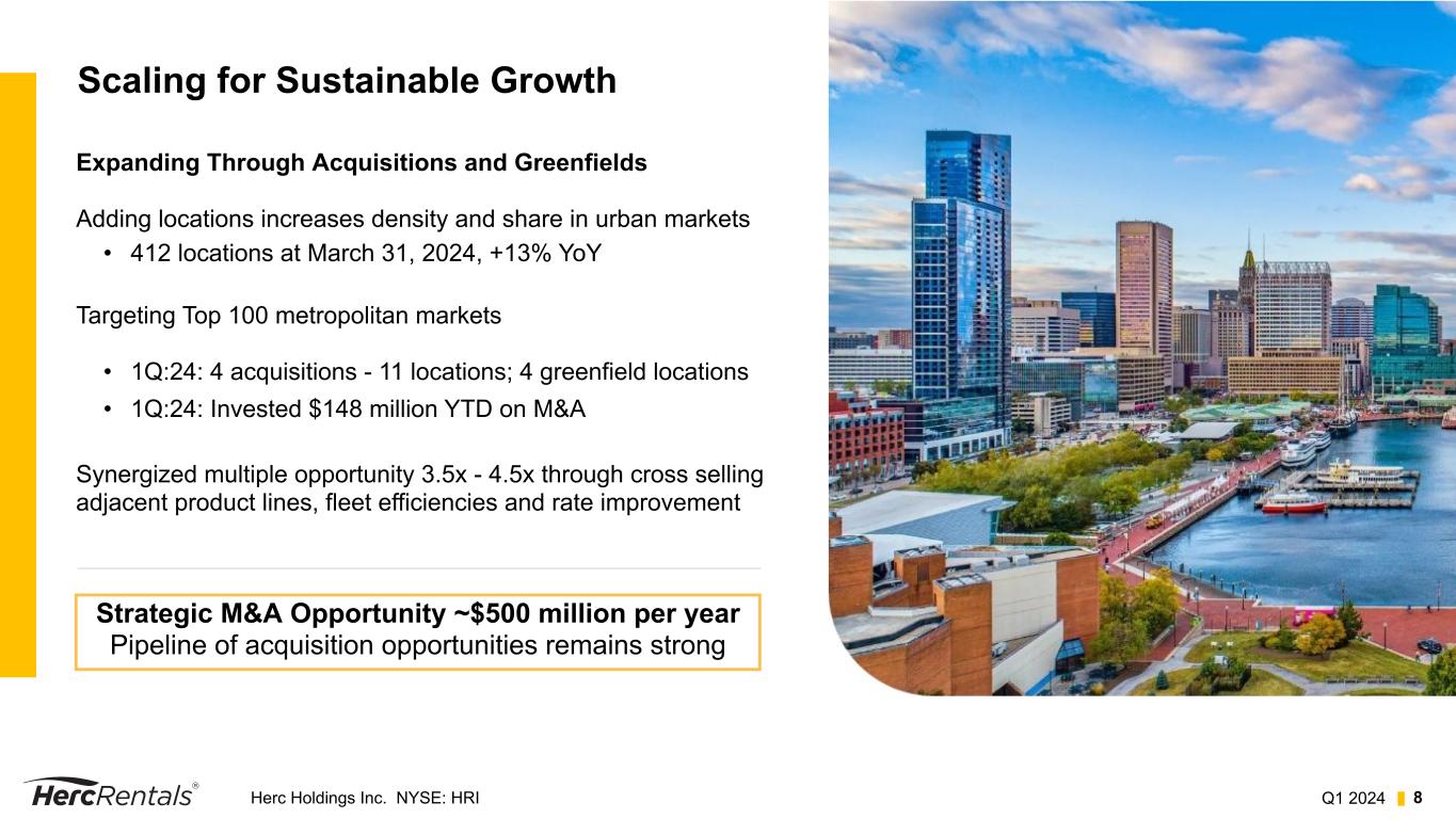 Q1 2024Herc Holdings Inc. NYSE: HRI 7 Focusing on Safety 1Q 2024: Continuing focus on Perfect Days • All branches reported > 97% Perfect Days • Perfect Days are those with no: • OSHA reportable incidents • At-fault moving vehicle accidents • DOT violations Total Recordable Incident Rate Improved to 0.76 —below 1.0 industry standard Proven safety record is a must-have for customers Herc's Safety Program is integrated into all acquisitions