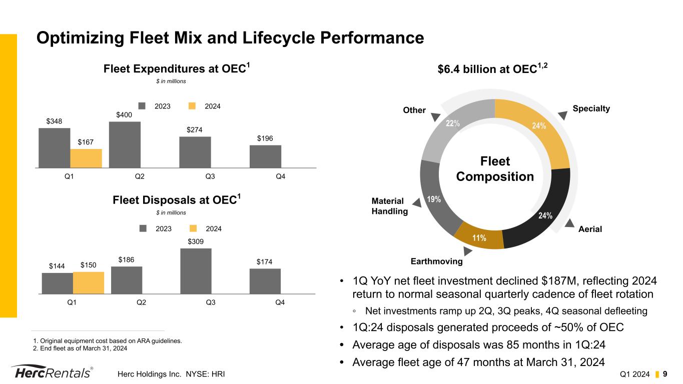 Q1 2024Herc Holdings Inc. NYSE: HRI 8 Scaling for Sustainable Growth Expanding Through Acquisitions and Greenfields Adding locations increases density and share in urban markets • 412 locations at March 31, 2024, +13% YoY Targeting Top 100 metropolitan markets • 1Q:24: 4 acquisitions - 11 locations; 4 greenfield locations • 1Q:24: Invested $148 million YTD on M&A Synergized multiple opportunity 3.5x - 4.5x through cross selling adjacent product lines, fleet efficiencies and rate improvement Strategic M&A Opportunity ~$500 million per year Pipeline of acquisition opportunities remains strong