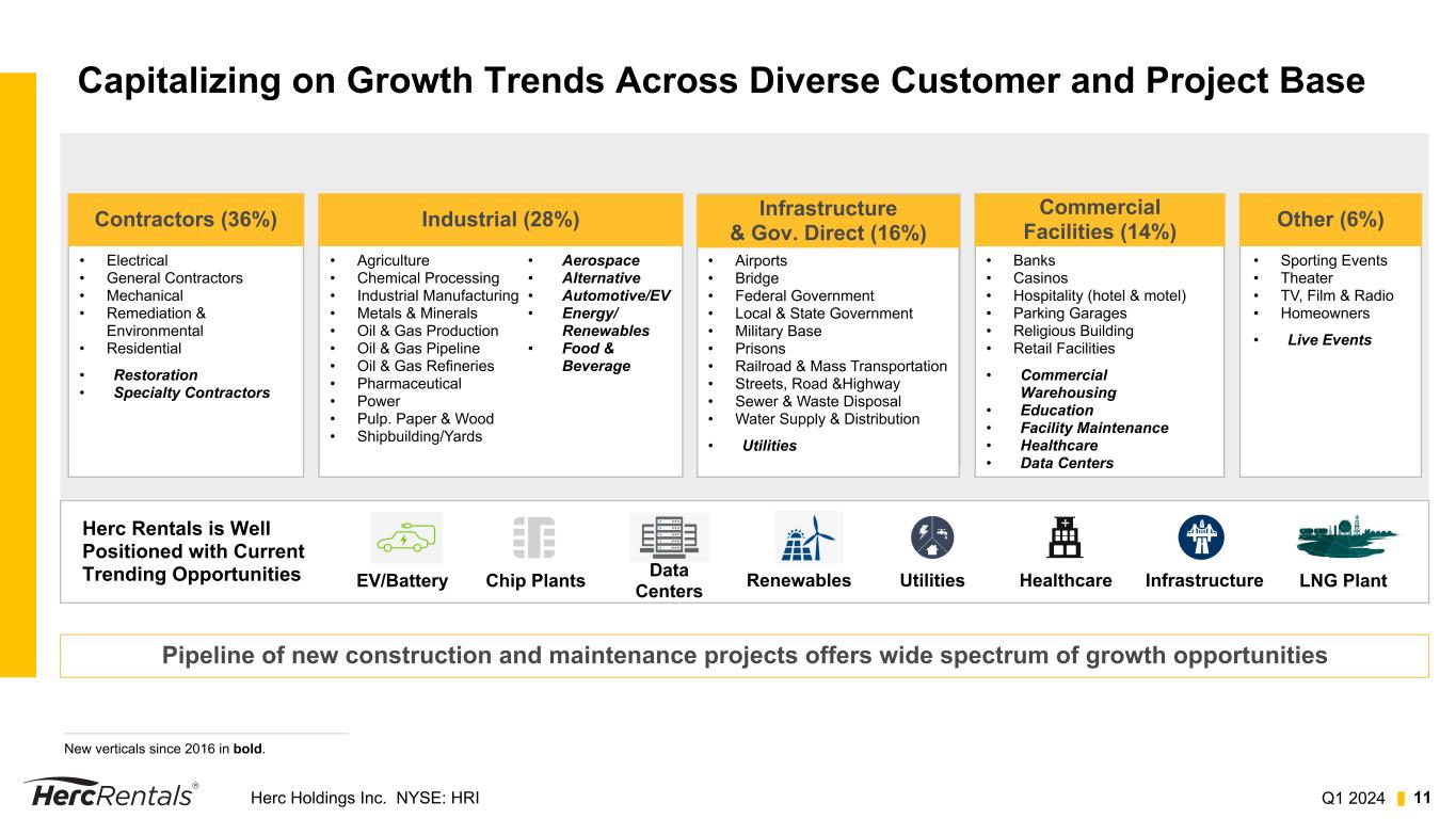 Q1 2024Herc Holdings Inc. NYSE: HRI 10 Delivering Growth and Resiliency through Diversification Q1 Local vs. National Mix 45% 55% NationalQ1 Revenue by Customer1 36% 28% 16% 14% 6% Local Commercial Facilities Contractors Infrastructure & Government Other Industrial • Local account revenue increased due to acquisitions and greenfields, and a focus on growth markets • National account revenue continues to benefit from general growth and mega project activity ◦ Vertical sales strategy provides for end-market expertise and creates more diverse revenue mix ◦ Project pipeline remains strong; still in early innings of federal-funding opportunities • Long-term, balanced target of 60% local / 40% national accounts 1. Refer to our 10-K for description of industries related to each customer classification.