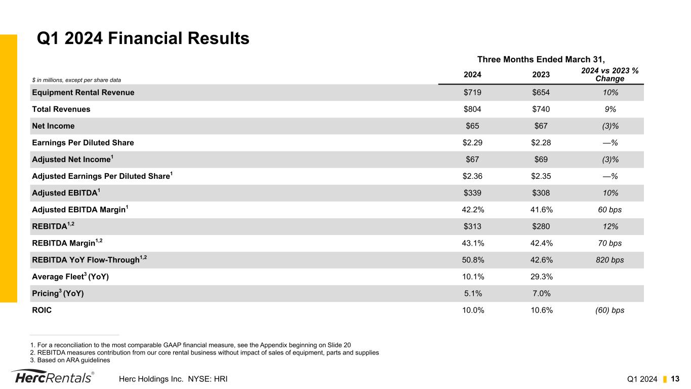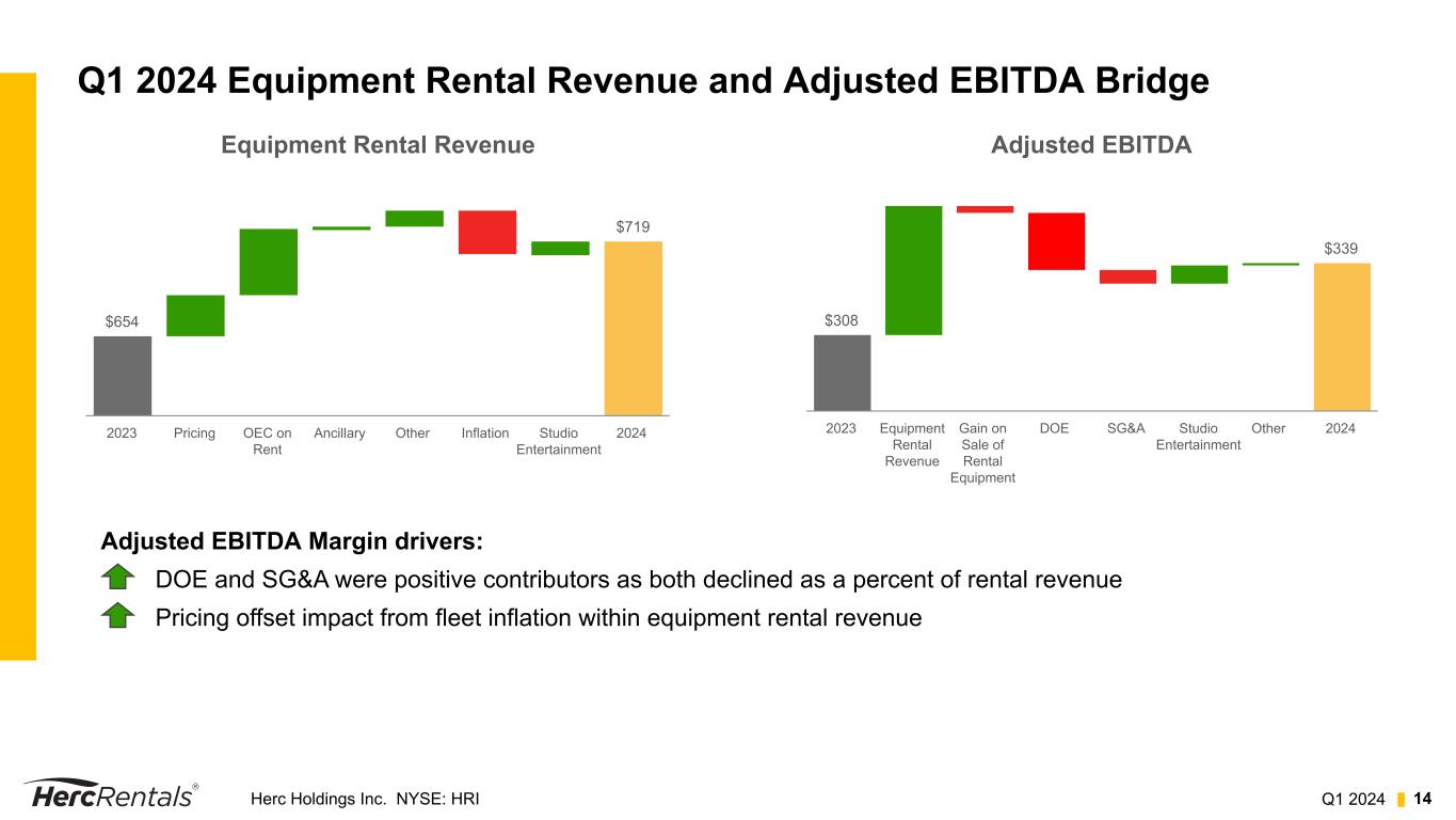 Q1 2024Herc Holdings Inc. NYSE: HRI 13 Q1 2024 Financial Results 1. For a reconciliation to the most comparable GAAP financial measure, see the Appendix beginning on Slide 20 2. REBITDA measures contribution from our core rental business without impact of sales of equipment, parts and supplies 3. Based on ARA guidelines Three Months Ended March 31, $ in millions, except per share data 2024 2023 2024 vs 2023 % Change Equipment Rental Revenue $719 $654 10% Total Revenues $804 $740 9% Net Income $65 $67 (3)% Earnings Per Diluted Share $2.29 $2.28 —% Adjusted Net Income1 $67 $69 (3)% Adjusted Earnings Per Diluted Share1 $2.36 $2.35 —% Adjusted EBITDA1 $339 $308 10% Adjusted EBITDA Margin1 42.2% 41.6% 60 bps REBITDA1,2 $313 $280 12% REBITDA Margin1,2 43.1% 42.4% 70 bps REBITDA YoY Flow-Through1,2 50.8% 42.6% 820 bps Average Fleet3 (YoY) 10.1% 29.3% Pricing3 (YoY) 5.1% 7.0% ROIC 10.0% 10.6% (60) bps