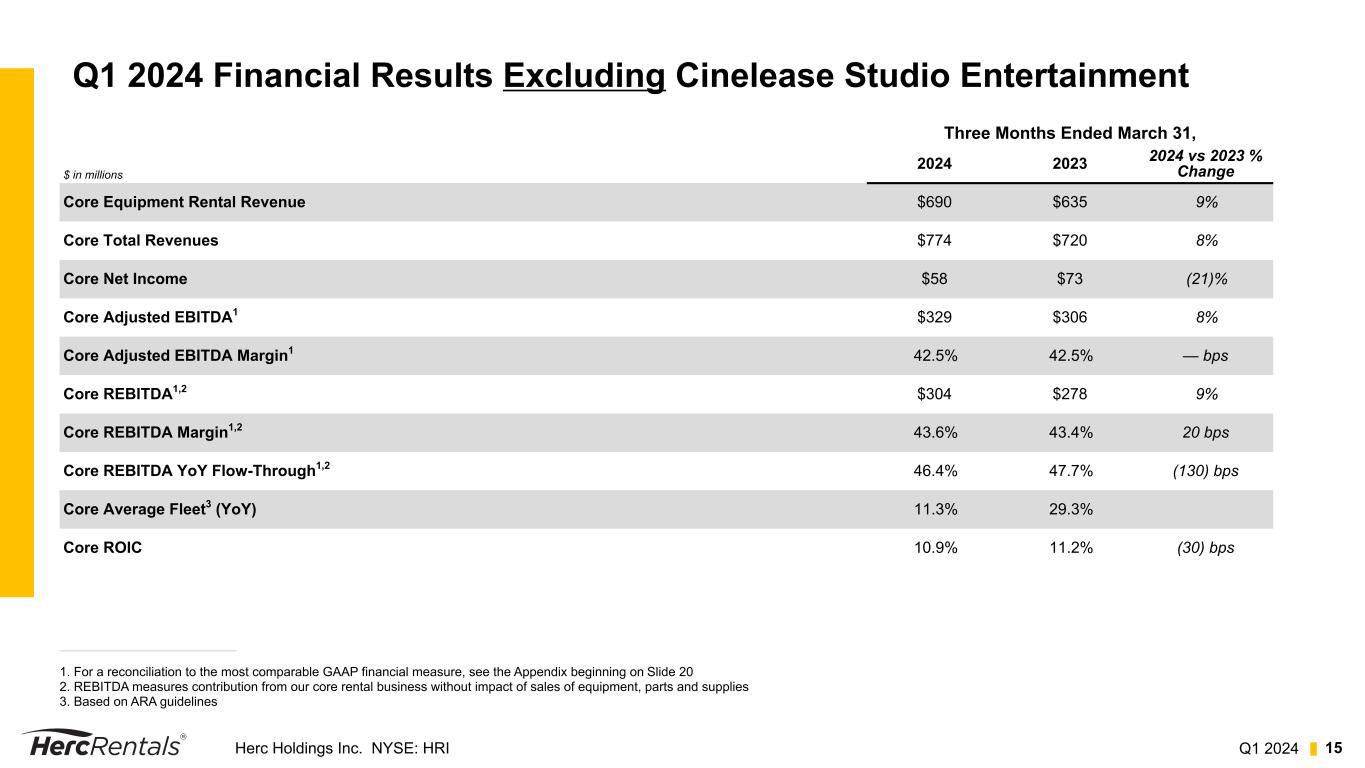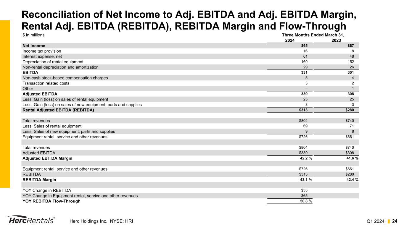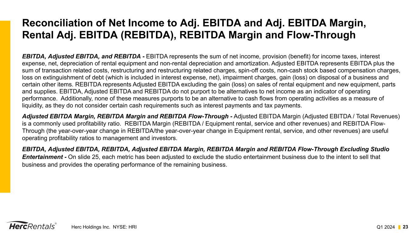 Q1 2024Herc Holdings Inc. NYSE: HRI 23 Reconciliation of Net Income to Adj. EBITDA and Adj. EBITDA Margin, Rental Adj. EBITDA (REBITDA), REBITDA Margin and Flow-Through EBITDA, Adjusted EBITDA, and REBITDA - EBITDA represents the sum of net income, provision (benefit) for income taxes, interest expense, net, depreciation of rental equipment and non-rental depreciation and amortization. Adjusted EBITDA represents EBITDA plus the sum of transaction related costs, restructuring and restructuring related charges, spin-off costs, non-cash stock based compensation charges, loss on extinguishment of debt (which is included in interest expense, net), impairment charges, gain (loss) on disposal of a business and certain other items. REBITDA represents Adjusted EBITDA excluding the gain (loss) on sales of rental equipment and new equipment, parts and supplies. EBITDA, Adjusted EBITDA and REBITDA do not purport to be alternatives to net income as an indicator of operating performance. Additionally, none of these measures purports to be an alternative to cash flows from operating activities as a measure of liquidity, as they do not consider certain cash requirements such as interest payments and tax payments. Adjusted EBITDA Margin, REBITDA Margin and REBITDA Flow-Through - Adjusted EBITDA Margin (Adjusted EBITDA / Total Revenues) is a commonly used profitability ratio. REBITDA Margin (REBITDA / Equipment rental, service and other revenues) and REBITDA Flow- Through (the year-over-year change in REBITDA/the year-over-year change in Equipment rental, service, and other revenues) are useful operating profitability ratios to management and investors. EBITDA, Adjusted EBITDA, REBITDA, Adjusted EBITDA Margin, REBITDA Margin and REBITDA Flow-Through Excluding Studio Entertainment - On slide 25, each metric has been adjusted to exclude the studio entertainment business due to the intent to sell that business and provides the operating performance of the remaining business.