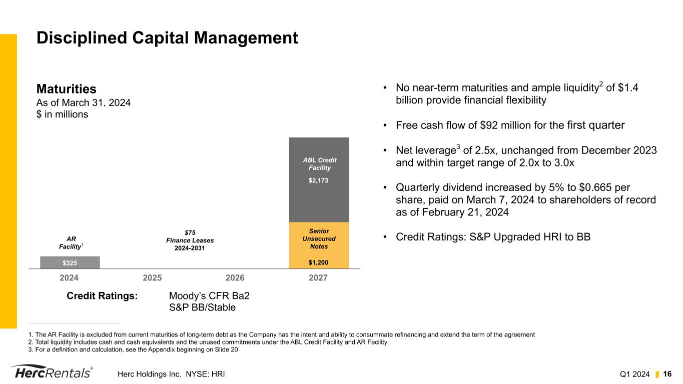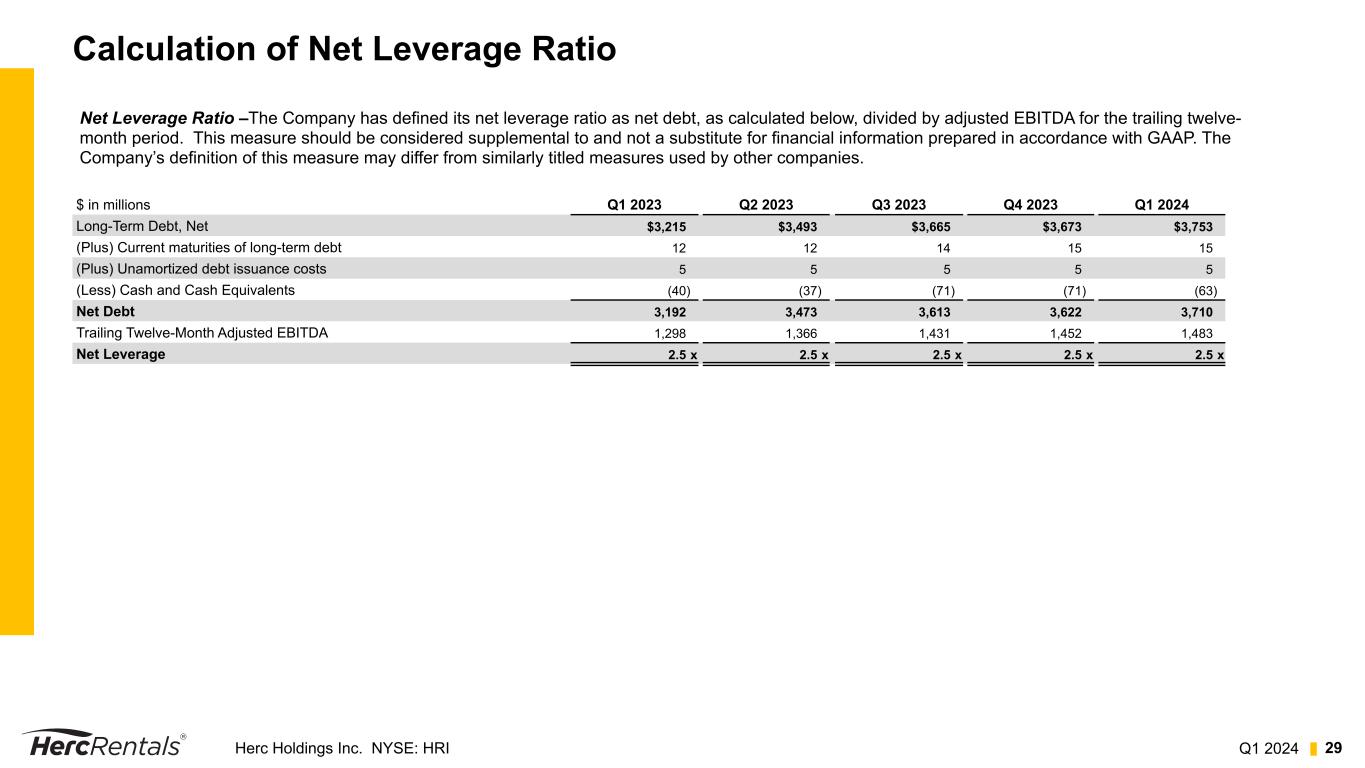Q1 2024Herc Holdings Inc. NYSE: HRI 29 Calculation of Net Leverage Ratio $ in millions Q1 2023 Q2 2023 Q3 2023 Q4 2023 Q1 2024 Long-Term Debt, Net $3,215 $3,493 $3,665 $3,673 $3,753 (Plus) Current maturities of long-term debt 12 12 14 15 15 (Plus) Unamortized debt issuance costs 5 5 5 5 5 (Less) Cash and Cash Equivalents (40) (37) (71) (71) (63) Net Debt 3,192 3,473 3,613 3,622 3,710 Trailing Twelve-Month Adjusted EBITDA 1,298 1,366 1,431 1,452 1,483 Net Leverage 2.5 x 2.5 x 2.5 x 2.5 x 2.5 x Net Leverage Ratio –The Company has defined its net leverage ratio as net debt, as calculated below, divided by adjusted EBITDA for the trailing twelve- month period. This measure should be considered supplemental to and not a substitute for financial information prepared in accordance with GAAP. The Company’s definition of this measure may differ from similarly titled measures used by other companies.
