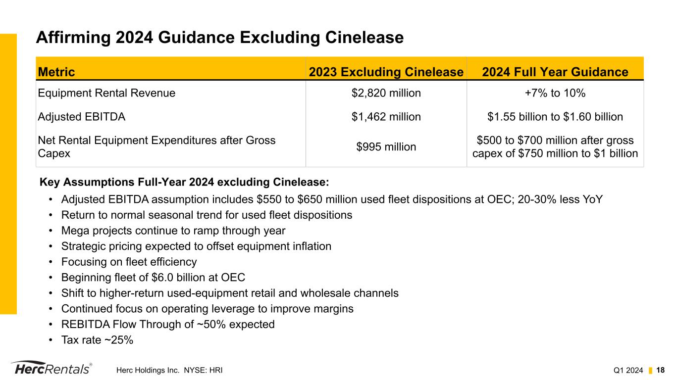 The Company is affirming its full year 2024 equipment rental revenue growth, adjusted EBITDA, and gross and net rental capital expenditures guidance ranges presented below, excluding Cinelease studio entertainment and lighting and grip equipment rental business. The guidance range for the full year 2024 adjusted EBITDA reflects an increase of 6% to 9% compared to full year 2023 results, excluding Cinelease. The sale process for the Cinelease studio entertainment business is ongoing.