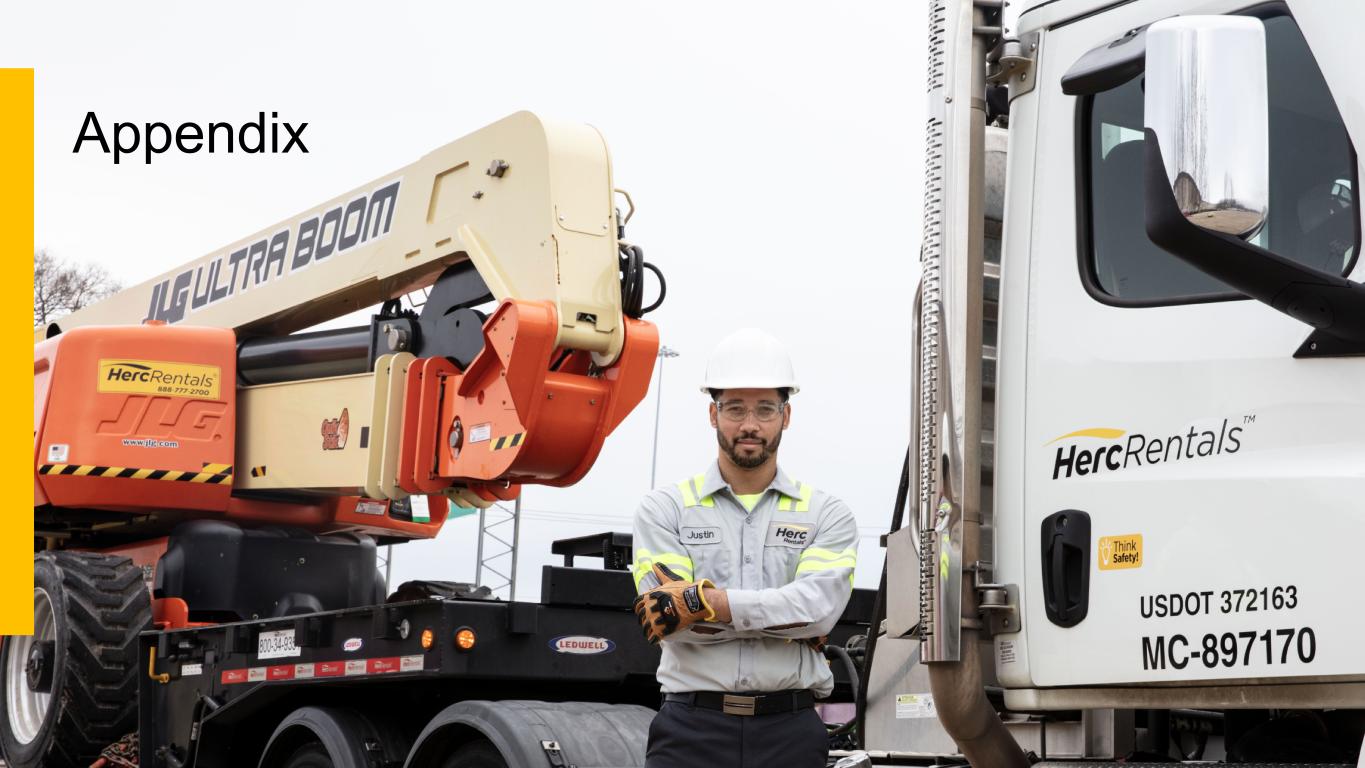 Q1 2024Herc Holdings Inc. NYSE: HRI 24 Reconciliation of Net Income to Adj. EBITDA and Adj. EBITDA Margin, Rental Adj. EBITDA (REBITDA), REBITDA Margin and Flow-Through $ in millions Three Months Ended March 31, 2024 2023 Net income $65 $67 Income tax provision 16 8 Interest expense, net 61 48 Depreciation of rental equipment 160 152 Non-rental depreciation and amortization 29 26 EBITDA 331 301 Non-cash stock-based compensation charges 5 4 Transaction related costs 3 2 Other — 1 Adjusted EBITDA 339 308 Less: Gain (loss) on sales of rental equipment 23 25 Less: Gain (loss) on sales of new equipment, parts and supplies 3 3 Rental Adjusted EBITDA (REBITDA) $313 $280 Total revenues $804 $740 Less: Sales of rental equipment 69 71 Less: Sales of new equipment, parts and supplies 9 8 Equipment rental, service and other revenues $726 $661 Total revenues $804 $740 Adjusted EBITDA $339 $308 Adjusted EBITDA Margin 42.2 % 41.6 % Equipment rental, service and other revenues $726 $661 REBITDA $313 $280 REBITDA Margin 43.1 % 42.4 % YOY Change in REBITDA $33 YOY Change in Equipment rental, service and other revenues $65 YOY REBITDA Flow-Through 50.8 %