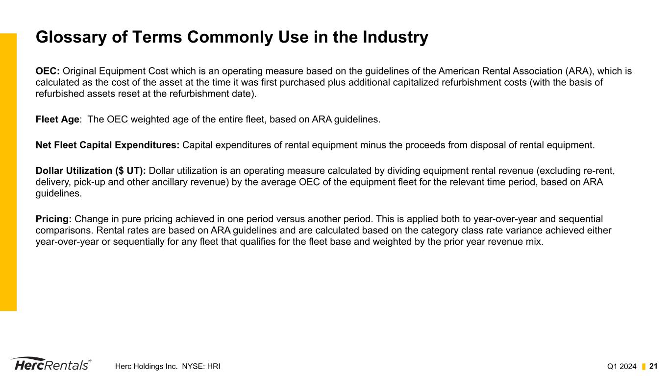 Q1 2024Herc Holdings Inc. NYSE: HRI 21 Glossary of Terms Commonly Use in the Industry OEC: Original Equipment Cost which is an operating measure based on the guidelines of the American Rental Association (ARA), which is calculated as the cost of the asset at the time it was first purchased plus additional capitalized refurbishment costs (with the basis of refurbished assets reset at the refurbishment date). Fleet Age: The OEC weighted age of the entire fleet, based on ARA guidelines. Net Fleet Capital Expenditures: Capital expenditures of rental equipment minus the proceeds from disposal of rental equipment. Dollar Utilization ($ UT): Dollar utilization is an operating measure calculated by dividing equipment rental revenue (excluding re-rent, delivery, pick-up and other ancillary revenue) by the average OEC of the equipment fleet for the relevant time period, based on ARA guidelines. Pricing: Change in pure pricing achieved in one period versus another period. This is applied both to year-over-year and sequential comparisons. Rental rates are based on ARA guidelines and are calculated based on the category class rate variance achieved either year-over-year or sequentially for any fleet that qualifies for the fleet base and weighted by the prior year revenue mix.