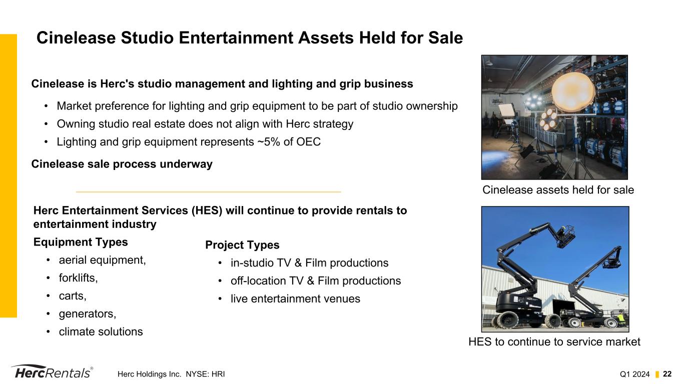 Q1 2024Herc Holdings Inc. NYSE: HRI 22 Cinelease Studio Entertainment Assets Held for Sale Cinelease is Herc's studio management and lighting and grip business • Market preference for lighting and grip equipment to be part of studio ownership • Owning studio real estate does not align with Herc strategy • Lighting and grip equipment represents ~5% of OEC Cinelease sale process underway Herc Entertainment Services (HES) will continue to provide rentals to entertainment industry Equipment Types • aerial equipment, • forklifts, • carts, • generators, • climate solutions Cinelease assets held for sale HES to continue to service market Project Types • in-studio TV & Film productions • off-location TV & Film productions • live entertainment venues