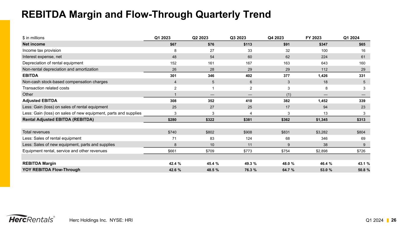 Q1 2024Herc Holdings Inc. NYSE: HRI 25 Reconciliation of Net Income to Adj. EBITDA and Adj. EBITDA Margin, Rental Adj. EBITDA (REBITDA), REBITDA Margin and Flow-Through, Excluding Studio Entertainment $ in millions Three Months Ended March 31, 2024 2024 2023 Herc Studio Entertainment Herc, excl Studio Herc Studio Entertainment Herc, excl Studio Equipment rental revenue $719 $29 $690 $654 $19 $635 Total revenues 804 30 774 740 20 720 Total expenses 723 21 702 665 28 637 Income (loss) before income taxes 81 9 72 75 (8) 83 Income tax (provision) benefit (16) (2) (14) (8) 2 (10) Net income $65 $7 $58 $67 ($6) $73 Income tax provision 16 2 14 8 (2) 10 Interest expense, net 61 — 61 48 — 48 Depreciation of rental equipment 160 — 160 152 8 144 Non-rental depreciation and amortization 29 — 29 26 1 25 EBITDA 331 9 322 301 1 300 Non-cash stock-based compensation charges 5 — 5 4 — 4 Transaction related costs 3 1 2 2 — 2 Other — — — 1 1 — Adjusted EBITDA 339 10 329 308 2 306 Less: Gain (loss) on sales of rental equipment 23 — 23 25 — 25 Less: Gain (loss) on sales of new equipment, parts and supplies 3 1 2 3 — 3 Rental Adjusted EBITDA (REBITDA) $313 $9 $304 $280 $2 $278 Total revenues $804 $30 $774 $740 $20 $720 Less: Sales of rental equipment 69 — 69 71 — 71 Less: Sales of new equipment, parts and supplies 9 1 8 8 — 8 Equipment rental, service and other revenues $726 $29 $697 $661 $20 $641 Total revenues $804 $30 $774 $740 $20 $720 Adjusted EBITDA $339 $10 $329 $308 $2 $306 Adjusted EBITDA Margin 42.2 % 33.3 % 42.5 % 41.6 % 10.0 % 42.5 % Equipment rental, service and other revenues $726 $29 $697 $661 $20 $641 REBITDA $313 $9 $304 $280 $2 $278 REBITDA Margin 43.1 % 31.0 % 43.6 % 42.4 % 10.0 % 43.4 % YOY Change in REBITDA $33 $7 $26 $55 ($8) $63 YOY Change in Equipment rental, service and other revenues $65 $9 $56 $129 ($3) $132 YOY REBITDA Flow-Through 50.8 % 77.8 % 46.4 % 42.6 % 266.7 % 47.7 %