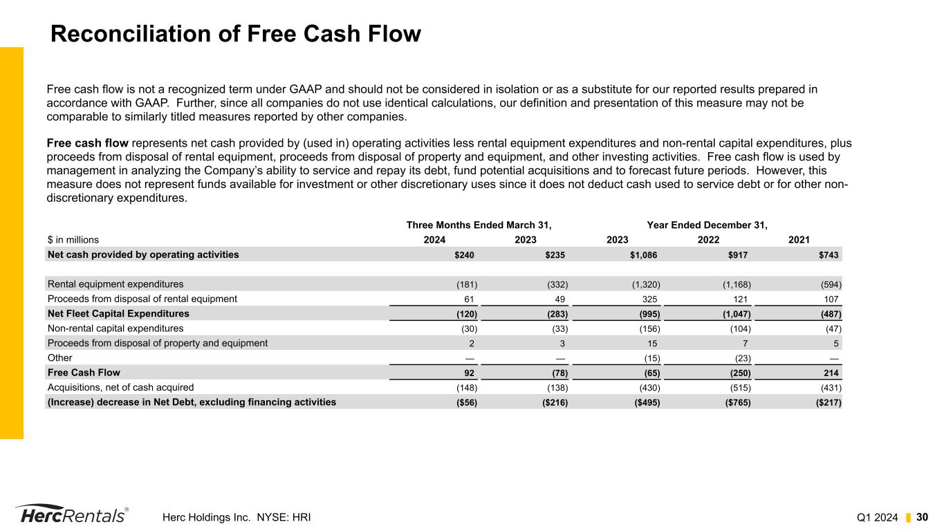 Q1 2024Herc Holdings Inc. NYSE: HRI 30 Reconciliation of Free Cash Flow Three Months Ended March 31, Year Ended December 31, $ in millions 2024 2023 2023 2022 2021 Net cash provided by operating activities $240 $235 $1,086 $917 $743 Rental equipment expenditures (181) (332) (1,320) (1,168) (594) Proceeds from disposal of rental equipment 61 49 325 121 107 Net Fleet Capital Expenditures (120) (283) (995) (1,047) (487) Non-rental capital expenditures (30) (33) (156) (104) (47) Proceeds from disposal of property and equipment 2 3 15 7 5 Other — — (15) (23) — Free Cash Flow 92 (78) (65) (250) 214 Acquisitions, net of cash acquired (148) (138) (430) (515) (431) (Increase) decrease in Net Debt, excluding financing activities ($56) ($216) ($495) ($765) ($217) Free cash flow is not a recognized term under GAAP and should not be considered in isolation or as a substitute for our reported results prepared in accordance with GAAP. Further, since all companies do not use identical calculations, our definition and presentation of this measure may not be comparable to similarly titled measures reported by other companies. Free cash flow represents net cash provided by (used in) operating activities less rental equipment expenditures and non-rental capital expenditures, plus proceeds from disposal of rental equipment, proceeds from disposal of property and equipment, and other investing activities. Free cash flow is used by management in analyzing the Company’s ability to service and repay its debt, fund potential acquisitions and to forecast future periods. However, this measure does not represent funds available for investment or other discretionary uses since it does not deduct cash used to service debt or for other non- discretionary expenditures.