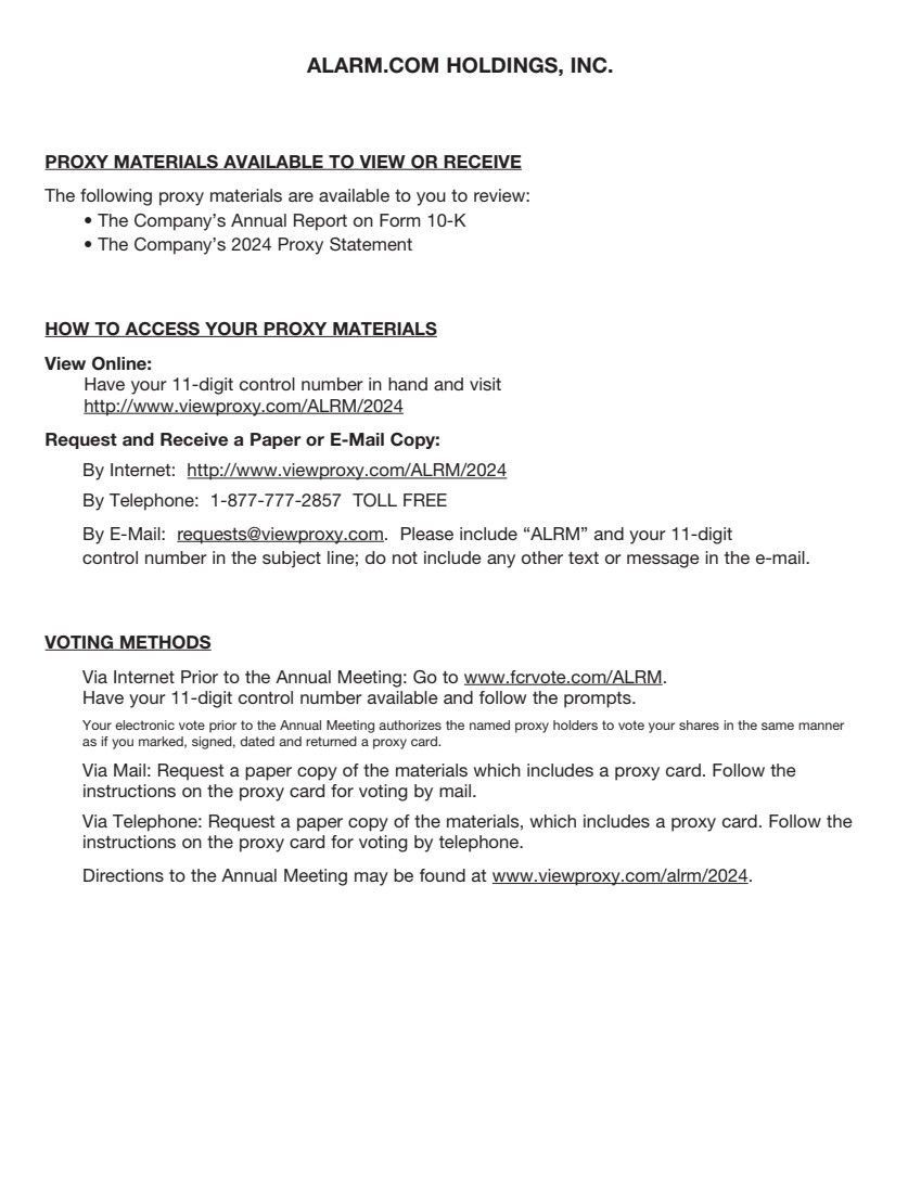 | ALARM.COM HOLDINGS, INC. PROXY MATERIALS AVAILABLE TO VIEW OR RECEIVE The following proxy materials are available to you to review: • The Company’s Annual Report on Form 10-K • The Company’s 2024 Proxy Statement HOW TO ACCESS YOUR PROXY MATERIALS View Online: Have your 11-digit control number in hand and visit http://www.viewproxy.com/ALRM/2024 Request and Receive a Paper or E-Mail Copy: By Internet: http://www.viewproxy.com/ALRM/2024 By Telephone: 1-877-777-2857 TOLL FREE By E-Mail: requests@viewproxy.com. Please include “ALRM” and your 11-digit control number in the subject line; do not include any other text or message in the e-mail. VOTING METHODS Via Internet Prior to the Annual Meeting: Go to www.fcrvote.com/ALRM. Have your 11-digit control number available and follow the prompts. Your electronic vote prior to the Annual Meeting authorizes the named proxy holders to vote your shares in the same manner as if you marked, signed, dated and returned a proxy card. Via Mail: Request a paper copy of the materials which includes a proxy card. Follow the instructions on the proxy card for voting by mail. Via Telephone: Request a paper copy of the materials, which includes a proxy card. Follow the instructions on the proxy card for voting by telephone. Directions to the Annual Meeting may be found at www.viewproxy.com/alrm/2024. |