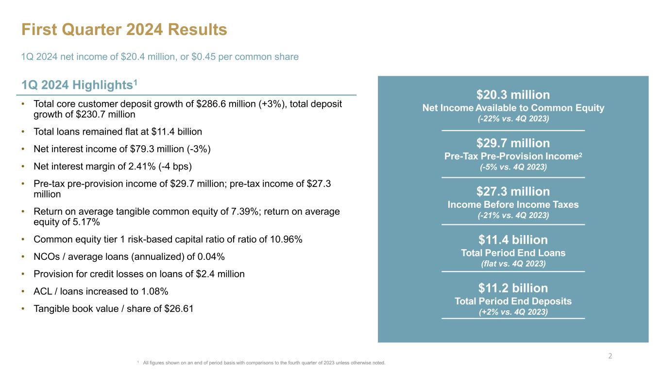 First Quarter 2024 Results 1Q 2024 Highlights1 • Total core customer deposit growth of $286.6 million (+3%), total deposit growth of $230.7 million • Total loans remained flat at $11.4 billion • Net interest income of $79.3 million (-3%) • Net interest margin of 2.41% (-4 bps) • Pre-tax pre-provision income of $29.7 million; pre-tax income of $27.3 million • Return on average tangible common equity of 7.39%; return on average equity of 5.17% • Common equity tier 1 risk-based capital ratio of ratio of 10.96% • NCOs / average loans (annualized) of 0.04% • Provision for credit losses on loans of $2.4 million • ACL / loans increased to 1.08% • Tangible book value / share of $26.61 1Q 2024 net income of $20.4 million, or $0.45 per common share $20.3 million Net Income Available to Common Equity (-22% vs. 4Q 2023) $29.7 million Pre-Tax Pre-Provision Income2 (-5% vs. 4Q 2023) $27.3 million Income Before Income Taxes (-21% vs. 4Q 2023) $11.4 billion Total Period End Loans (flat vs. 4Q 2023) $11.2 billion Total Period End Deposits (+2% vs. 4Q 2023) 1 All figures shown on an end of period basis with comparisons to the fourth quarter of 2023 unless otherwise noted. 2