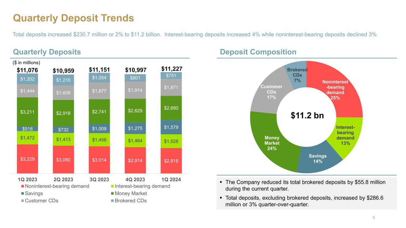 •Total loans remained level at $11.4 billion as of March 31, 2024 compared to December 31, 2023. During the current quarter, we reduced our concentration in the investor commercial real estate segment by $106.5 million, while the AD&C portfolio increased $101.3 million. Total commercial business loans and lines and mortgage and consumer loan portfolios remained relatively unchanged during this period.