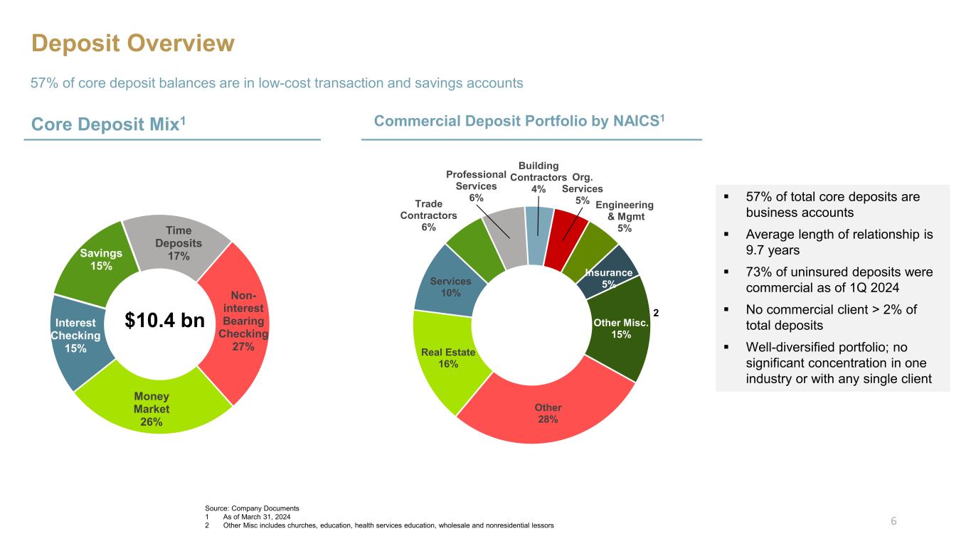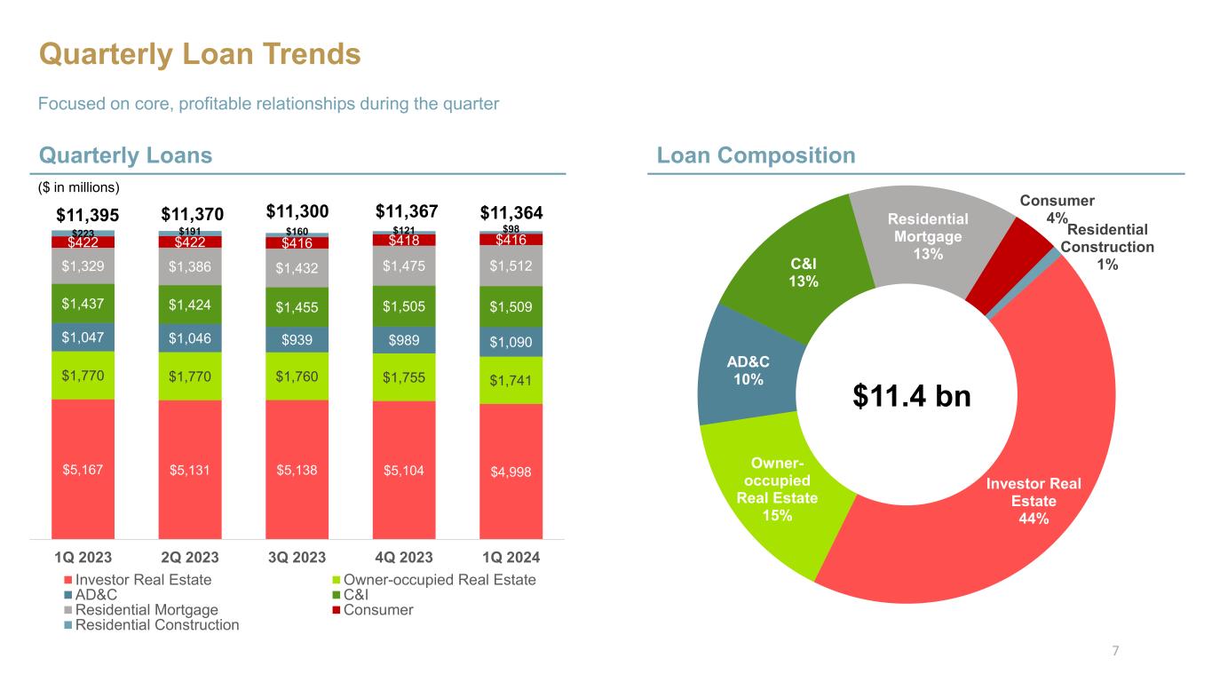 Investor Real Estate 44% Owner- occupied Real Estate 15% AD&C 10% C&I 13% Residential Mortgage 13% Consumer 4% Residential Construction 1% $5,167 $5,131 $5,138 $5,104 $4,998 $1,770 $1,770 $1,760 $1,755 $1,741 $1,047 $1,046 $939 $989 $1,090 $1,437 $1,424 $1,455 $1,505 $1,509 $1,329 $1,386 $1,432 $1,475 $1,512 $422 $422 $416 $418 $416$223 $191 $160 $121 $98 1Q 2023 2Q 2023 3Q 2023 4Q 2023 1Q 2024 Investor Real Estate Owner-occupied Real Estate AD&C C&I Residential Mortgage Consumer Residential Construction Quarterly Loan Trends Quarterly Loans Focused on core, profitable relationships during the quarter $11,395 $11,370 $11,300 $11,367 $11,364 ($ in millions) Loan Composition $11.4 bn 7