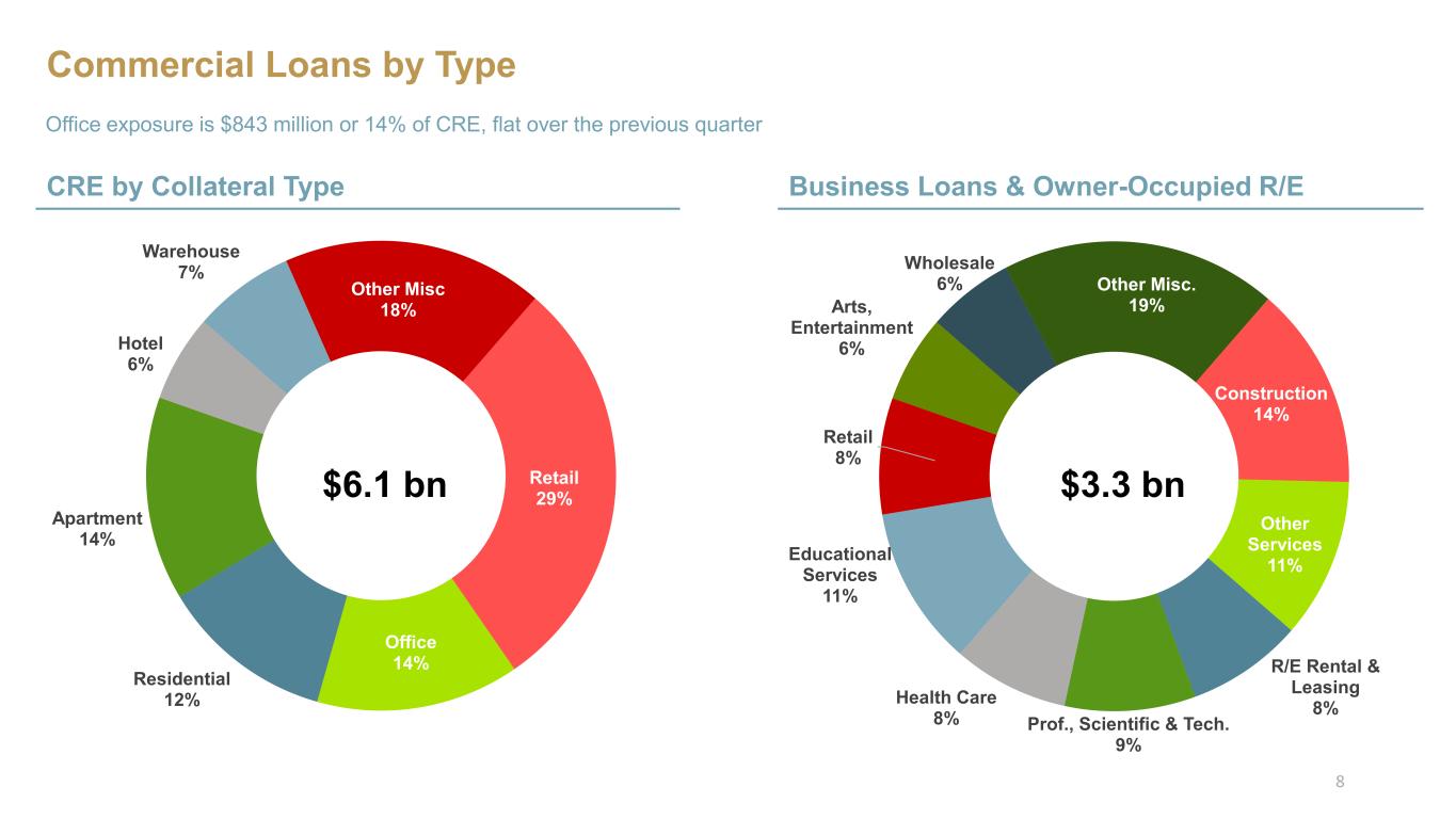 Construction 14% Other Services 11% R/E Rental & Leasing 8% Prof., Scientific & Tech. 9% Health Care 8% Educational Services 11% Retail 8% Arts, Entertainment 6% Wholesale 6% Other Misc. 19% Retail 29% Office 14% Residential 12% Apartment 14% Hotel 6% Warehouse 7% Other Misc 18% Commercial Loans by Type CRE by Collateral Type Office exposure is $843 million or 14% of CRE, flat over the previous quarter Business Loans & Owner-Occupied R/E $6.1 bn $3.3 bn 8