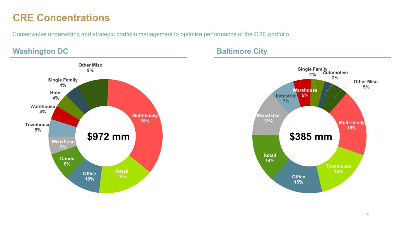CRE Concentrations Washington DC Conservative underwriting and strategic portfolio management to optimize performance of the CRE portfolio Baltimore City Multi-family 35% Retail 16%Office 10% Condo 8% Mixed Use 5% Townhouse 5% Warehouse 4% Hotel 4% Single Family 4% Other Misc 9% $972 mm Multi-family 19% Townhouse 16% Office 15% Retail 14% Mixed Use 13% Industrial 7% Warehouse 5% Single Family 4% Automotive 2% Other Misc. 5% $385 mm 9