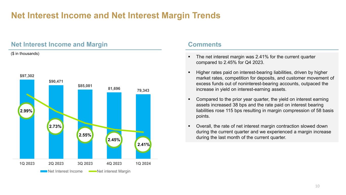 $97,302 $90,471 $85,081 81,696 79,343 2.00 2.50 3.00 3.50 0 20,000 40,000 60,000 80,000 100,000 120,000 1Q 2023 2Q 2023 3Q 2023 4Q 2023 1Q 2024 Net Interest Income Net interest Margin Net Interest Income and Net Interest Margin Trends Net Interest Income and Margin ($ in thousands) Comments The net interest margin was 2.41% for the current quarter compared to 2.45% for Q4 2023. Higher rates paid on interest-bearing liabilities, driven by higher market rates, competition for deposits, and customer movement of excess funds out of noninterest-bearing accounts, outpaced the increase in yield on interest-earning assets. Compared to the prior year quarter, the yield on interest earning assets increased 38 bps and the rate paid on interest bearing liabilities rose 115 bps resulting in margin compression of 58 basis points. Overall, the rate of net interest margin contraction slowed down during the current quarter and we experienced a margin increase during the last month of the current quarter. 2.99% 2.73% 2.55% 2.45% 2.41% 10