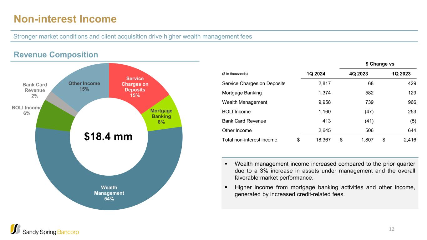 Yield and Cost Trends Selected Yields (%) Asset & Liability Yield / Rate Trends (%) Asset yields continue to reprice at higher rates while increases in deposit costs have moderated 4.63 4.75 4.83 4.92 5.01 2.49 2.93 3.29 3.54 3.64 0.00 1.00 2.00 3.00 4.00 5.00 6.00 Q1 2023 Q2 2023 Q3 2023 Q4 2023 Q1 2024 Pe rc en t Total earning assets Total interest-bearing liabilities 4.00 4.20 4.40 4.60 4.80 5.00 5.20 5.40 5.60 Q1 2023 Q2 2023 Q3 2023 Q4 2023 Q1 2024 Pe rc en t Commercial investor real estate loans Total commercial loans Total residential mortgage & consumer loans Total loans Total earning assets 11
