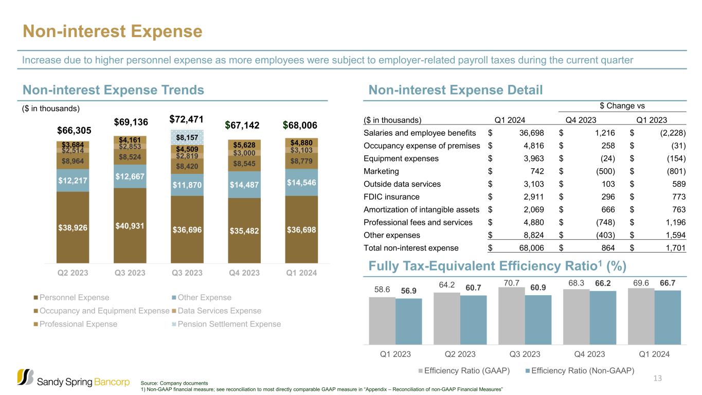 Service Charges on Deposits 15% Mortgage Banking 8% Wealth Management 54% BOLI Income 6% Bank Card Revenue 2% Other Income 15% Non-interest Income Revenue Composition Stronger market conditions and client acquisition drive higher wealth management fees $18.4 mm Wealth management income increased compared to the prior quarter due to a 3% increase in assets under management and the overall favorable market performance. Higher income from mortgage banking activities and other income, generated by increased credit-related fees. $ Change vs ($ in thousands) 1Q 2024 4Q 2023 1Q 2023 Service Charges on Deposits 2,817 68 429 Mortgage Banking 1,374 582 129 Wealth Management 9,958 739 966 BOLI Income 1,160 (47) 253 Bank Card Revenue 413 (41) (5) Other Income 2,645 506 644 Total non-interest income $ 18,367 $ 1,807 $ 2,416 12