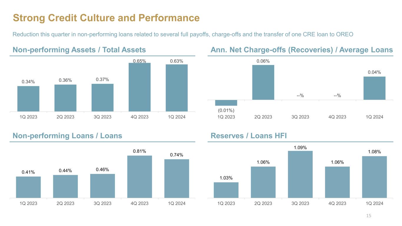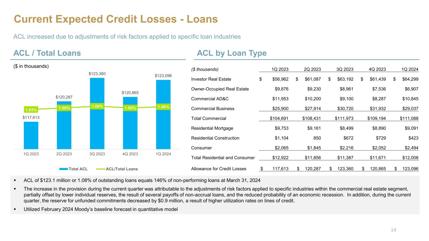 Current Expected Credit Losses - Loans ACL increased due to adjustments of risk factors applied to specific loan industries ACL by Loan TypeACL / Total Loans $117,613 $120,287 $123,360 $120,865 $123,096 1.03% 1.06% 1.09% 1.06% 1.08% $114,000 $115,000 $116,000 $117,000 $118,000 $119,000 $120,000 $121,000 $122,000 $123,000 $124,000 0.30% 0.50% 0.70% 0.90% 1.10% 1.30% 1.50% 1.70% 1Q 2023 2Q 2023 3Q 2023 4Q 2023 1Q 2024 Total ACL ACL/Total Loans ($ in thousands) ACL of $123.1 million or 1.08% of outstanding loans equals 146% of non-performing loans at March 31, 2024 The increase in the provision during the current quarter was attributable to the adjustments of risk factors applied to specific industries within the commercial real estate segment, partially offset by lower individual reserves, the result of several payoffs of non-accrual loans, and the reduced probability of an economic recession. In addition, during the current quarter, the reserve for unfunded commitments decreased by $0.9 million, a result of higher utilization rates on lines of credit. Utilized February 2024 Moody’s baseline forecast in quantitative model 14 ($ thousands) 1Q 2023 2Q 2023 3Q 2023 4Q 2023 1Q 2024 Investor Real Estate $ $56,962 $ $61,087 $ $63,192 $ $61,439 $ $64,299 Owner-Occupied Real Estate $9,876 $9,230 $8,961 $7,536 $6,907 Commercial AD&C $11,953 $10,200 $9,100 $8,287 $10,845 Commercial Business $25,900 $27,914 $30,720 $31,932 $29,037 Total Commercial $104,691 $108,431 $111,973 $109,194 $111,088 Residential Mortgage $9,753 $9,161 $8,499 $8,890 $9,091 Residential Construction $1,104 850 $672 $729 $423 Consumer $2,065 $1,845 $2,216 $2,052 $2,494 Total Residential and Consumer $12,922 $11,856 $11,387 $11,671 $12,008 Allowance for Credit Losses $ 117,613 $ 120,287 $ 123,360 $ 120,865 $ 123,096