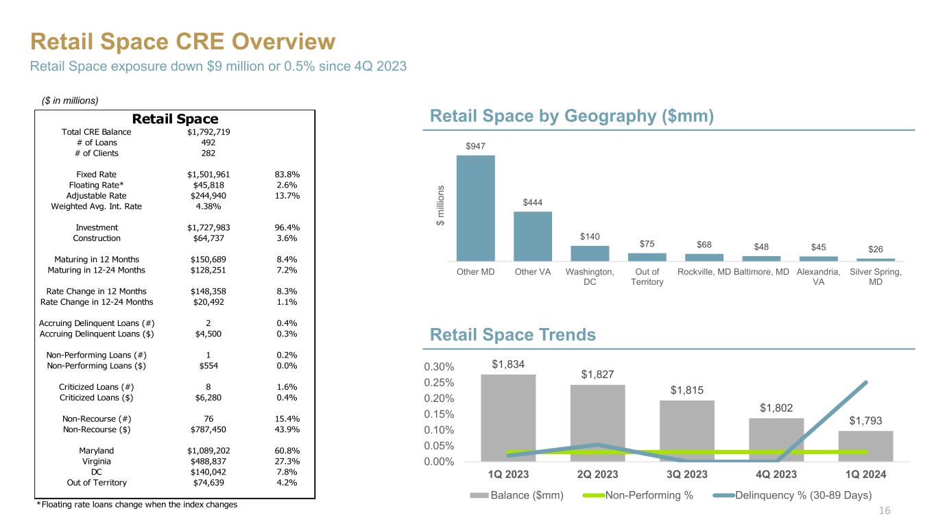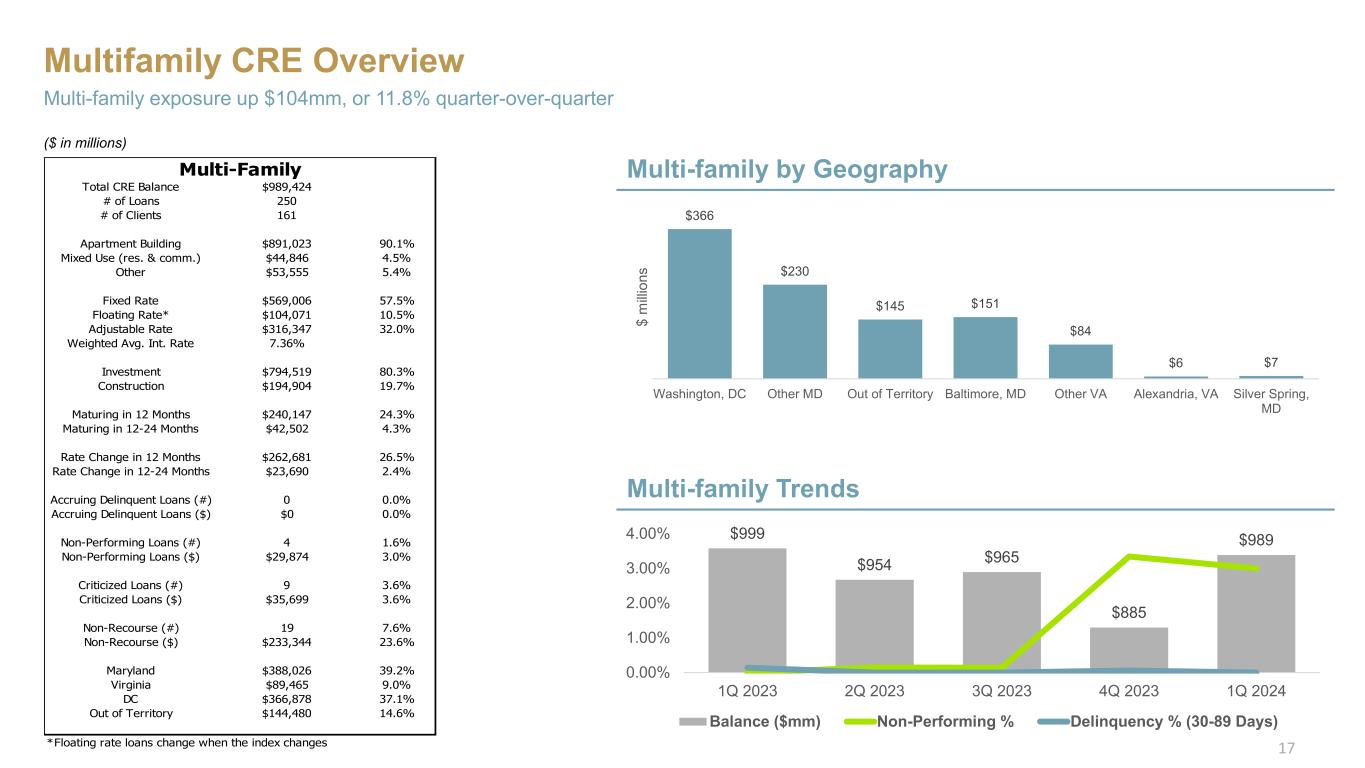 Retail Space CRE Overview Retail Space exposure down $9 million or 0.5% since 4Q 2023 $1,834 $1,827 $1,815 $1,802 $1,793 $1,770 $1,780 $1,790 $1,800 $1,810 $1,820 $1,830 $1,840 0.00% 0.05% 0.10% 0.15% 0.20% 0.25% 0.30% 1Q 2023 2Q 2023 3Q 2023 4Q 2023 1Q 2024 Balance ($mm) Non-Performing % Delinquency % (30-89 Days) Retail Space Trends Retail Space by Geography ($mm) $947 $444 $140 $75 $68 $48 $45 $26 Other MD Other VA Washington, DC Out of Territory Rockville, MD Baltimore, MD Alexandria, VA Silver Spring, MD $ m illi on s ($ in millions) 16 Total CRE Balance $1,792,719 # of Loans 492 # of Clients 282 Fixed Rate $1,501,961 83.8% Floating Rate* $45,818 2.6% Adjustable Rate $244,940 13.7% Weighted Avg. Int. Rate 4.38% Investment $1,727,983 96.4% Construction $64,737 3.6% Maturing in 12 Months $150,689 8.4% Maturing in 12-24 Months $128,251 7.2% Rate Change in 12 Months $148,358 8.3% Rate Change in 12-24 Months $20,492 1.1% Accruing Delinquent Loans (#) 2 0.4% Accruing Delinquent Loans ($) $4,500 0.3% Non-Performing Loans (#) 1 0.2% Non-Performing Loans ($) $554 0.0% Criticized Loans (#) 8 1.6% Criticized Loans ($) $6,280 0.4% Non-Recourse (#) 76 15.4% Non-Recourse ($) $787,450 43.9% Maryland $1,089,202 60.8% Virginia $488,837 27.3% DC $140,042 7.8% Out of Territory $74,639 4.2% *Floating rate loans change when the index changes Retail Space