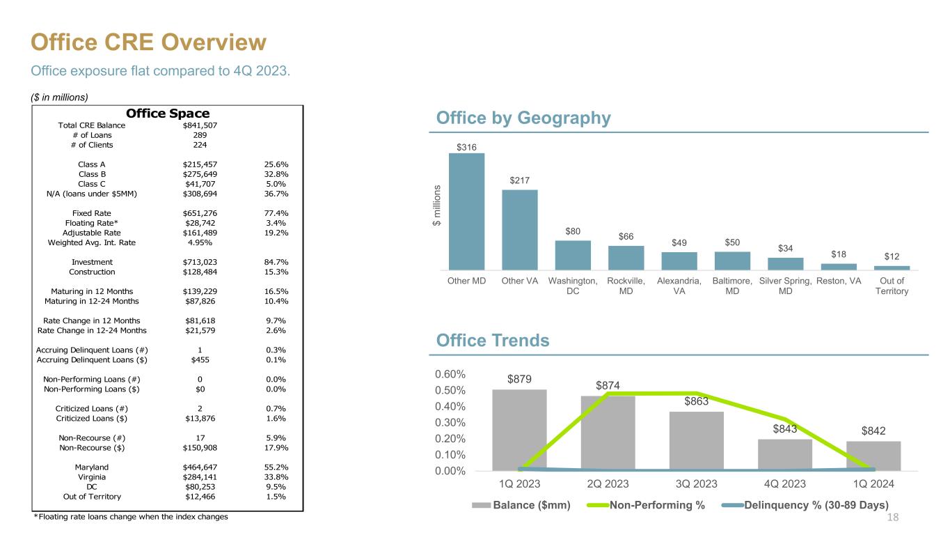 Multifamily CRE Overview Multi-family exposure up $104mm, or 11.8% quarter-over-quarter Multi-family Trends Multi-family by Geography $999 $954 $965 $885 $989 $820 $840 $860 $880 $900 $920 $940 $960 $980 $1,000 $1,020 0.00% 1.00% 2.00% 3.00% 4.00% 1Q 2023 2Q 2023 3Q 2023 4Q 2023 1Q 2024 Balance ($mm) Non-Performing % Delinquency % (30-89 Days) $366 $230 $145 $151 $84 $6 $7 Washington, DC Other MD Out of Territory Baltimore, MD Other VA Alexandria, VA Silver Spring, MD $ m illi on s ($ in millions) 17 Total CRE Balance $989,424 # of Loans 250 # of Clients 161 Apartment Building $891,023 90.1% Mixed Use (res. & comm.) $44,846 4.5% Other $53,555 5.4% Fixed Rate $569,006 57.5% Floating Rate* $104,071 10.5% Adjustable Rate $316,347 32.0% Weighted Avg. Int. Rate 7.36% Investment $794,519 80.3% Construction $194,904 19.7% Maturing in 12 Months $240,147 24.3% Maturing in 12-24 Months $42,502 4.3% Rate Change in 12 Months $262,681 26.5% Rate Change in 12-24 Months $23,690 2.4% Accruing Delinquent Loans (#) 0 0.0% Accruing Delinquent Loans ($) $0 0.0% Non-Performing Loans (#) 4 1.6% Non-Performing Loans ($) $29,874 3.0% Criticized Loans (#) 9 3.6% Criticized Loans ($) $35,699 3.6% Non-Recourse (#) 19 7.6% Non-Recourse ($) $233,344 23.6% Maryland $388,026 39.2% Virginia $89,465 9.0% DC $366,878 37.1% Out of Territory $144,480 14.6% *Floating rate loans change when the index changes Multi-Family