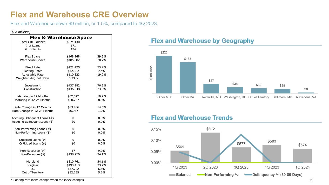 Office CRE Overview Office exposure flat compared to 4Q 2023. Office Trends Office by Geography $879 $874 $863 $843 $842 $820 $830 $840 $850 $860 $870 $880 $890 0.00% 0.10% 0.20% 0.30% 0.40% 0.50% 0.60% 1Q 2023 2Q 2023 3Q 2023 4Q 2023 1Q 2024 Balance ($mm) Non-Performing % Delinquency % (30-89 Days) $316 $217 $80 $66 $49 $50 $34 $18 $12 Other MD Other VA Washington, DC Rockville, MD Alexandria, VA Baltimore, MD Silver Spring, MD Reston, VA Out of Territory $ m illi on s ($ in millions) 18 Total CRE Balance $841,507 # of Loans 289 # of Clients 224 Class A $215,457 25.6% Class B $275,649 32.8% Class C $41,707 5.0% N/A (loans under $5MM) $308,694 36.7% Fixed Rate $651,276 77.4% Floating Rate* $28,742 3.4% Adjustable Rate $161,489 19.2% Weighted Avg. Int. Rate 4.95% Investment $713,023 84.7% Construction $128,484 15.3% Maturing in 12 Months $139,229 16.5% Maturing in 12-24 Months $87,826 10.4% Rate Change in 12 Months $81,618 9.7% Rate Change in 12-24 Months $21,579 2.6% Accruing Delinquent Loans (#) 1 0.3% Accruing Delinquent Loans ($) $455 0.1% Non-Performing Loans (#) 0 0.0% Non-Performing Loans ($) $0 0.0% Criticized Loans (#) 2 0.7% Criticized Loans ($) $13,876 1.6% Non-Recourse (#) 17 5.9% Non-Recourse ($) $150,908 17.9% Maryland $464,647 55.2% Virginia $284,141 33.8% DC $80,253 9.5% Out of Territory $12,466 1.5% *Floating rate loans change when the index changes Office Space