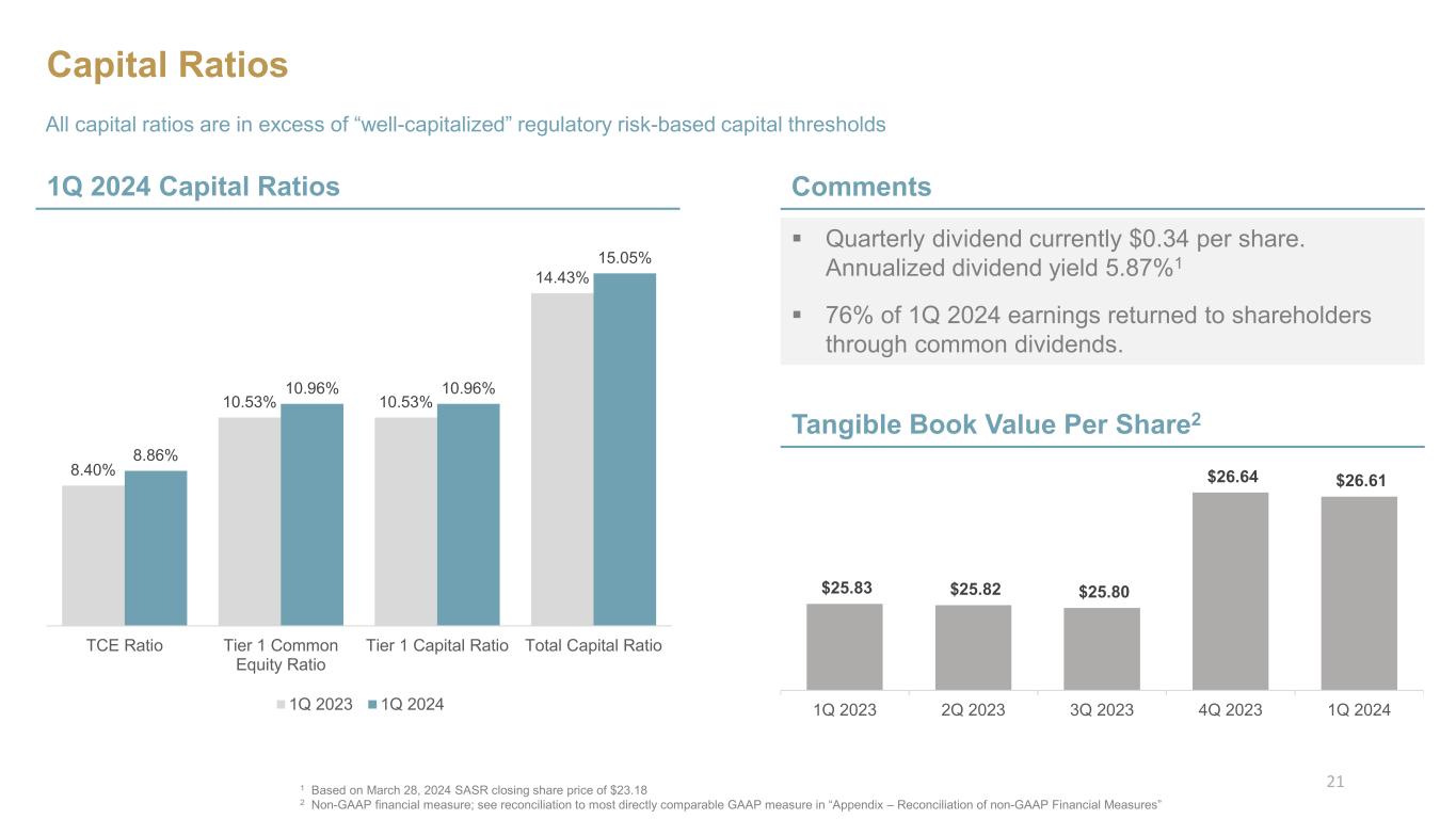 Capital Ratios 1Q 2024 Capital Ratios Comments Quarterly dividend currently $0.34 per share. Annualized dividend yield 5.87%1 76% of 1Q 2024 earnings returned to shareholders through common dividends. All capital ratios are in excess of “well-capitalized” regulatory risk-based capital thresholds Tangible Book Value Per Share2 $25.83 $25.82 $25.80 $26.64 $26.61 1Q 2023 2Q 2023 3Q 2023 4Q 2023 1Q 2024 1 Based on March 28, 2024 SASR closing share price of $23.18 2 Non-GAAP financial measure; see reconciliation to most directly comparable GAAP measure in “Appendix – Reconciliation of non-GAAP Financial Measures” 8.40% 10.53% 10.53% 14.43% 8.86% 10.96% 10.96% 15.05% 4.00% 6.00% 8.00% 10.00% 12.00% 14.00% 16.00% TCE Ratio Tier 1 Common Equity Ratio Tier 1 Capital Ratio Total Capital Ratio 1Q 2023 1Q 2024 21
