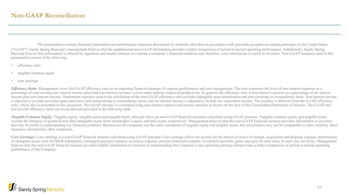 Non-GAAP Reconciliation This presentation contains financial information and performance measures determined by methods other than in accordance with generally accepted accounting principles in the United States (“GAAP”). Sandy Spring Bancorp’s management believes that the supplemental non-GAAP information provides a better comparison of period-to-period operating performance. Additionally, Sandy Spring Bancorp believes this information is utilized by regulators and market analysts to evaluate a company’s financial condition and, therefore, such information is useful to investors. Non-GAAP measures used in this presentation consist of the following: • efficiency ratio • tangible common equity • core earnings Efficiency Ratio. Management views the GAAP efficiency ratio as an important financial measure of expense performance and cost management. The ratio expresses the level of non-interest expenses as a percentage of total revenue (net interest income plus total non-interest income). Lower ratios indicate improved productivity. In general, the efficiency ratio is non-interest expenses as a percentage of net interest income plus non-interest income. Noninterest expenses used in the calculation of the non-GAAP efficiency ratio excludes intangible asset amortization and non-recurring or extraordinary items. Non-interest income is adjusted to exclude securities gains and losses and nonrecurring or extraordinary items, and net interest income is adjusted to include tax- equivalent income. The measure is different from the GAAP efficiency ratio, which also is presented in this document. The GAAP measure is calculated using non-interest expense and income amounts as shown on the face of the Consolidated Statements of Income. The GAAP and non-GAAP efficiency ratios are reconciled and provided in the following table. Tangible Common Equity. Tangible equity, tangible assets and tangible book value per share are non-GAAP financial measures calculated using GAAP amounts. Tangible common equity and tangible assets exclude the balances of goodwill and other intangible assets from stockholder’s equity and total assets, respectively. Management believes that this non-GAAP financial measure provides information to investors that may be useful in understanding our financial condition. Because not all companies use the same calculation of tangible equity and tangible assets, this presentation may not be comparable to other similarly titled measures calculated by other companies. Core Earnings. Core earnings is a non-GAAP financial measure calculated using GAAP amounts. Core earnings reflect net income for the period exclusive of merger, acquisition and disposal expense, amortization of intangible assets, loss on FHLB redemption, contingent payment expense, severance expense, pension settlement expense, investment securities gains, and gain on asset sales, in each case net of tax. Management believes that this non-GAAP financial measure provides helpful information to investors in understanding the Company’s core operating earnings and provides a better comparison of period-to-period operating performance of the Company. 24