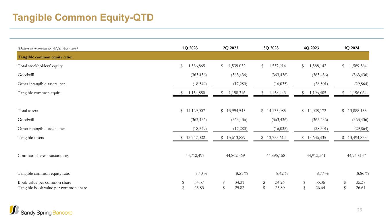 Tangible Common Equity-QTD (Dollars in thousands except per share data) 1Q 2023 2Q 2023 3Q 2023 4Q 2023 1Q 2024 Tangible common equity ratio: Total stockholders' equity $ 1,536,865 $ 1,539,032 $ 1,537,914 $ 1,588,142 $ 1,589,364 Goodwill (363,436) (363,436) (363,436) (363,436) (363,436) Other intangible assets, net (18,549) (17,280) (16,035) (28,301) (29,864) Tangible common equity $ 1,154,880 $ 1,158,316 $ 1,158,443 $ 1,196,405 $ 1,196,064 Total assets $ 14,129,007 $ 13,994,545 $ 14,135,085 $ 14,028,172 $ 13,888,133 Goodwill (363,436) (363,436) (363,436) (363,436) (363,436) Other intangible assets, net (18,549) (17,280) (16,035) (28,301) (29,864) Tangible assets $ 13,747,022 $ 13,613,829 $ 13,755,614 $ 13,636,435 $ 13,494,833 Common shares outstanding 44,712,497 44,862,369 44,895,158 44,913,561 44,940,147 Tangible common equity ratio 8.40 % 8.51 % 8.42 % 8.77 % 8.86 % Book value per common share $ 34.37 $ 34.31 $ 34.26 $ 35.36 $ 35.37 Tangible book value per common share $ 25.83 $ 25.82 $ 25.80 $ 26.64 $ 26.61 26