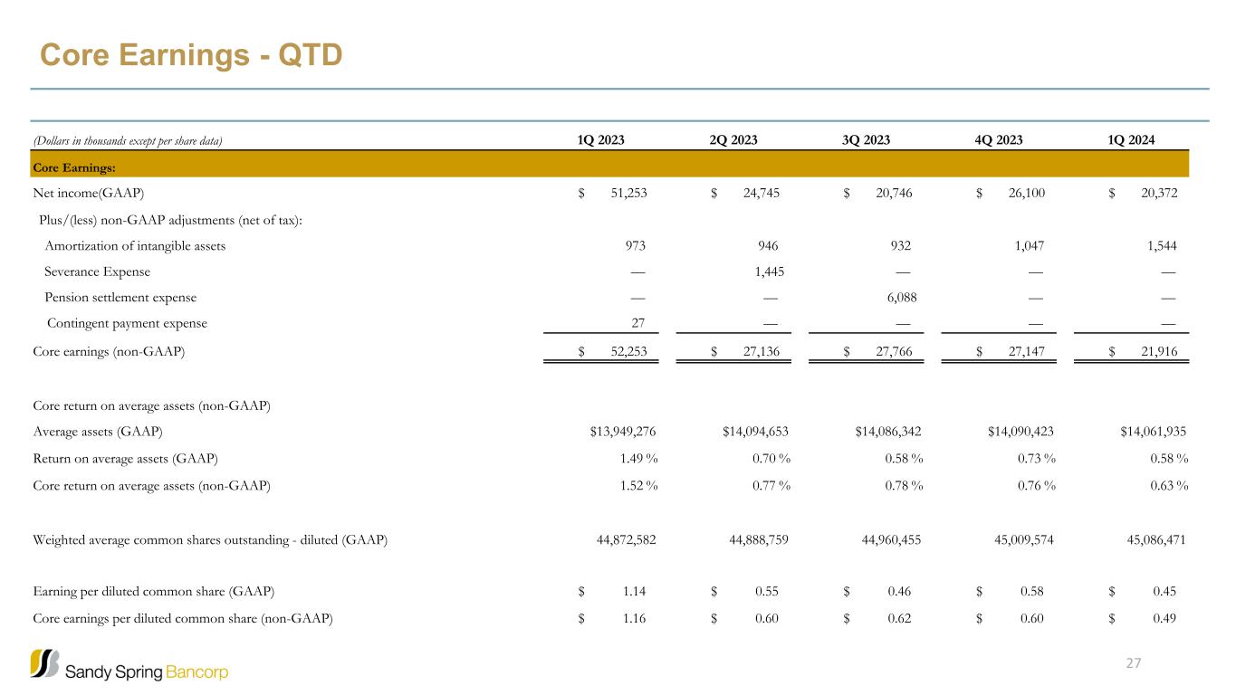 Core Earnings - QTD (Dollars in thousands except per share data) 1Q 2023 2Q 2023 3Q 2023 4Q 2023 1Q 2024 Core Earnings: Net income(GAAP) $ 51,253 $ 24,745 $ 20,746 $ 26,100 $ 20,372 Plus/(less) non-GAAP adjustments (net of tax): Amortization of intangible assets 973 946 932 1,047 1,544 Severance Expense — 1,445 — — — Pension settlement expense — — 6,088 — — Contingent payment expense 27 — — — — Core earnings (non-GAAP) $ 52,253 $ 27,136 $ 27,766 $ 27,147 $ 21,916 Core return on average assets (non-GAAP) Average assets (GAAP) $13,949,276 $14,094,653 $14,086,342 $14,090,423 $14,061,935 Return on average assets (GAAP) 1.49 % 0.70 % 0.58 % 0.73 % 0.58 % Core return on average assets (non-GAAP) 1.52 % 0.77 % 0.78 % 0.76 % 0.63 % Weighted average common shares outstanding - diluted (GAAP) 44,872,582 44,888,759 44,960,455 45,009,574 45,086,471 Earning per diluted common share (GAAP) $ 1.14 $ 0.55 $ 0.46 $ 0.58 $ 0.45 Core earnings per diluted common share (non-GAAP) $ 1.16 $ 0.60 $ 0.62 $ 0.60 $ 0.49 27