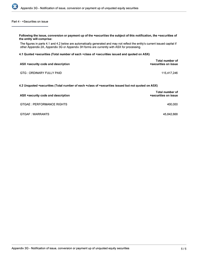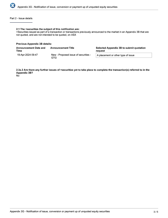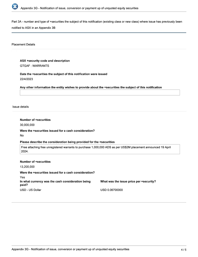 | 99.1 | Appendix 3G - Notification of issue, conversion or payment up of unquoted equity securities |