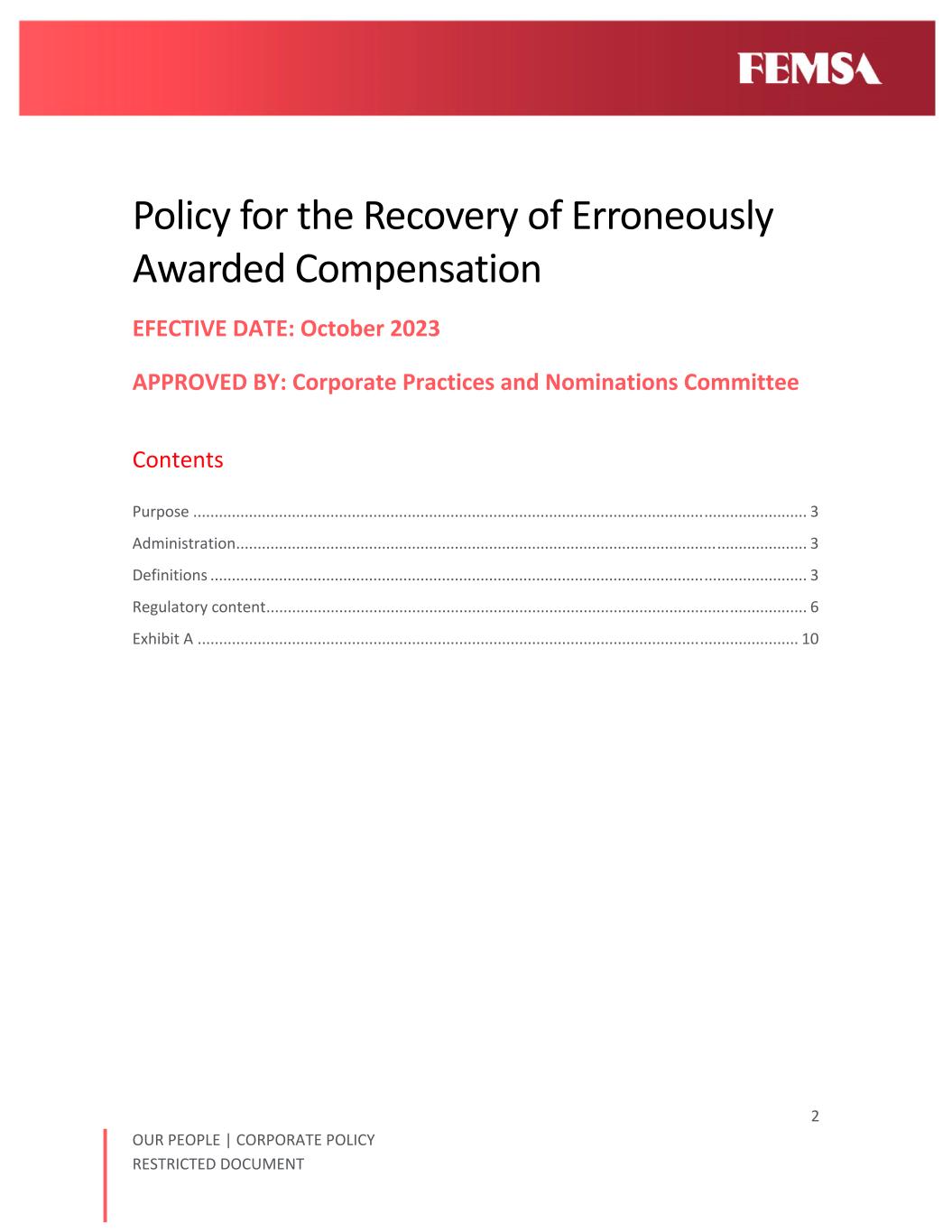 POLICY FOR THE RECOVERY OF ERRONEOUSLY AWARDED COMPENSATION OUR PEOPLE | CORPORATE POLICY RESTRICTED DOCUMENT 2 Policy for the Recovery of Erroneously Awarded Compensation EFECTIVE DATE: October 2023 APPROVED BY: Corporate Practices and Nominations Committee Contents Purpose ............................................................................................................................................... 3 Administration ..................................................................................................................................... 3 Definitions ........................................................................................................................................... 3 Regulatory content .............................................................................................................................. 6 Exhibit A ............................................................................................................................................ 10