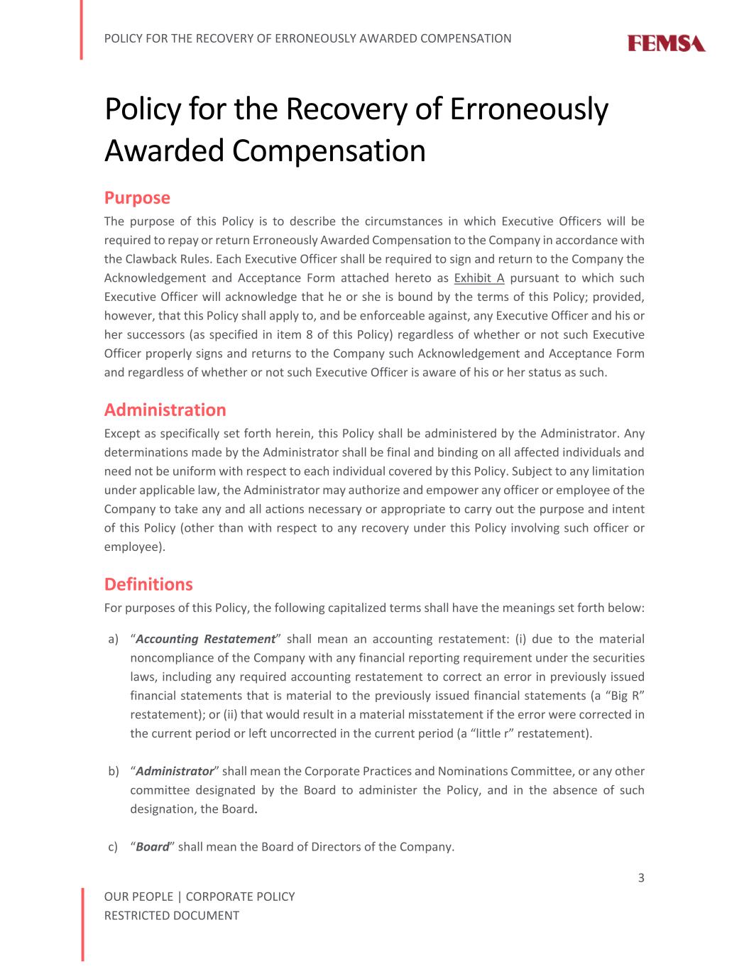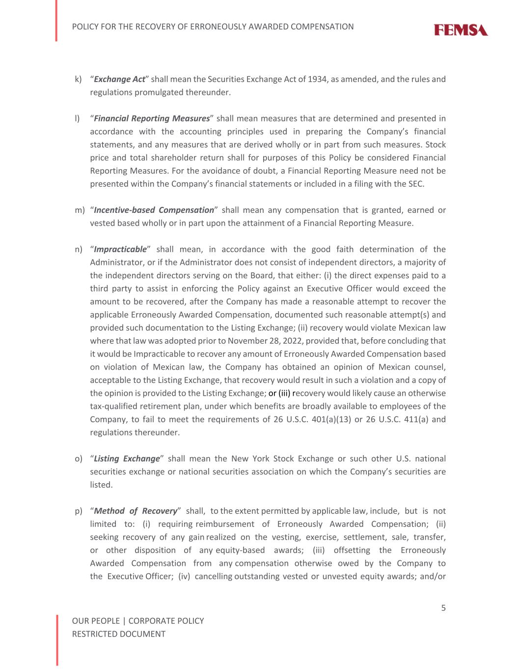 POLICY FOR THE RECOVERY OF ERRONEOUSLY AWARDED COMPENSATION OUR PEOPLE | CORPORATE POLICY RESTRICTED DOCUMENT 4 d) “Clawback Eligible Incentive Compensation” shall mean, with respect to each individual who served as an Executive Officer at any time during the applicable performance period for any Incentive-based Compensation (whether or not such individual is serving as an Executive Officer at the time the Erroneously Awarded Compensation is required to be repaid to the Company), all Incentive-based Compensation Received by such individual: (i) on or after the Effective Date; (ii) after beginning service as an Executive Officer; (iii) while the Company has a class of securities listed on the Listing Exchange; and (iv) during the applicable Clawback Period. e) “Clawback Period” shall mean, with respect to any Accounting Restatement, the three completed fiscal years of the Company immediately preceding the Restatement Date and any transition period (that results from a change in the Company’s fiscal year) of less than nine months within or immediately following those three completed fiscal years. f) “Clawback Rules” shall mean Section 10D of the Exchange Act and any applicable rules or standards adopted by the SEC thereunder (including Rule 10D-1 under the Exchange Act) or the Listing Exchange pursuant to Rule 10D-1 under the Exchange Act (including Section 303A.14 of the New York Stock Exchange Listed Company Manual), in each case as may be in effect from time to time. g) “Company” shall mean Fomento Económico Mexicano, S.A.B. de C.V., together with each of its direct and indirect subsidiaries. h) “Effective Date” shall mean October 2, 2023. i) “Erroneously Awarded Compensation” shall mean, with respect to each Executive Officer in connection with an Accounting Restatement, the amount of Clawback Eligible Incentive Compensation that exceeds the amount of Clawback Eligible Incentive Compensation that otherwise would have been Received had it been determined based on the restated amounts, computed without regard to any taxes paid. j) “Executive Officer” shall mean any individual who is or was an executive officer as determined by the Administrator in accordance with the definition of “executive officer” as set forth in the Clawback Rules and any other senior executive, employee or other personnel of the Company who may from time to time be deemed subject to the Policy by the Administrator. For the avoidance of doubt, the Administrator shall have full discretion to determine which individuals in the Company shall be considered an “Executive Officer” for purposes of this Policy. A list of executive officers determined by the Administrator to be “Executive Officers” for purposes of this policy is set forth in Exhibit B, which may be revised from time to time at the sole discretion of the Administrator.