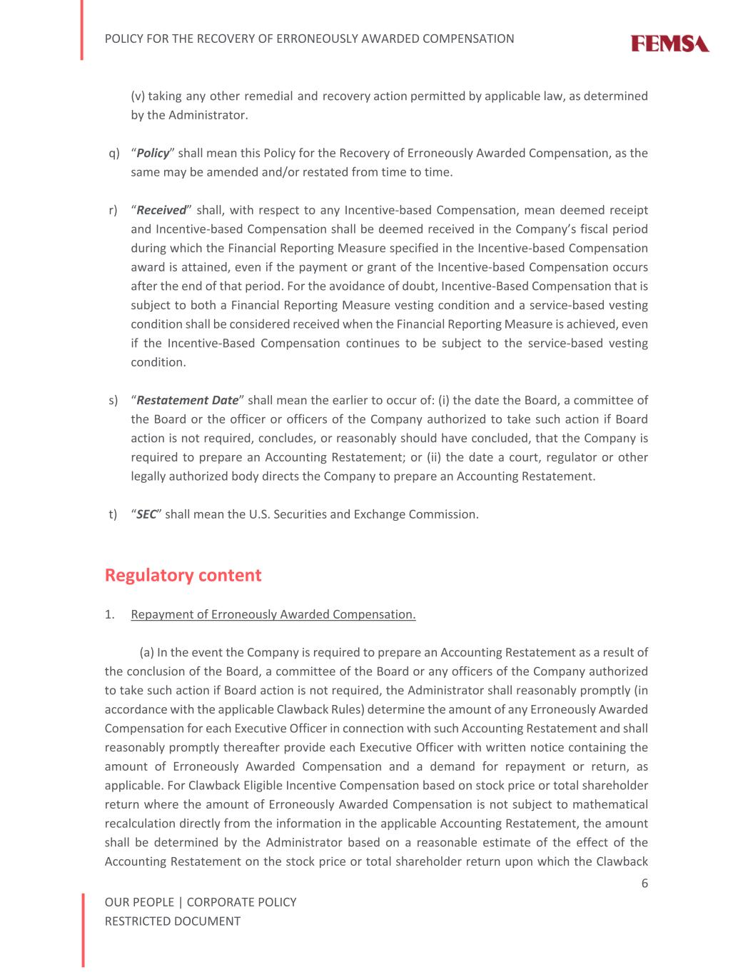 POLICY FOR THE RECOVERY OF ERRONEOUSLY AWARDED COMPENSATION OUR PEOPLE | CORPORATE POLICY RESTRICTED DOCUMENT 6 (v) taking any other remedial and recovery action permitted by applicable law, as determined by the Administrator. q) “Policy” shall mean this Policy for the Recovery of Erroneously Awarded Compensation, as the same may be amended and/or restated from time to time. r) “Received” shall, with respect to any Incentive-based Compensation, mean deemed receipt and Incentive-based Compensation shall be deemed received in the Company’s fiscal period during which the Financial Reporting Measure specified in the Incentive-based Compensation award is attained, even if the payment or grant of the Incentive-based Compensation occurs after the end of that period. For the avoidance of doubt, Incentive-Based Compensation that is subject to both a Financial Reporting Measure vesting condition and a service-based vesting condition shall be considered received when the Financial Reporting Measure is achieved, even if the Incentive-Based Compensation continues to be subject to the service-based vesting condition. s) “Restatement Date” shall mean the earlier to occur of: (i) the date the Board, a committee of the Board or the officer or officers of the Company authorized to take such action if Board action is not required, concludes, or reasonably should have concluded, that the Company is required to prepare an Accounting Restatement; or (ii) the date a court, regulator or other legally authorized body directs the Company to prepare an Accounting Restatement. t) “SEC” shall mean the U.S. Securities and Exchange Commission. Regulatory content 1. Repayment of Erroneously Awarded Compensation. (a) In the event the Company is required to prepare an Accounting Restatement as a result of the conclusion of the Board, a committee of the Board or any officers of the Company authorized to take such action if Board action is not required, the Administrator shall reasonably promptly (in accordance with the applicable Clawback Rules) determine the amount of any Erroneously Awarded Compensation for each Executive Officer in connection with such Accounting Restatement and shall reasonably promptly thereafter provide each Executive Officer with written notice containing the amount of Erroneously Awarded Compensation and a demand for repayment or return, as applicable. For Clawback Eligible Incentive Compensation based on stock price or total shareholder return where the amount of Erroneously Awarded Compensation is not subject to mathematical recalculation directly from the information in the applicable Accounting Restatement, the amount shall be determined by the Administrator based on a reasonable estimate of the effect of the Accounting Restatement on the stock price or total shareholder return upon which the Clawback