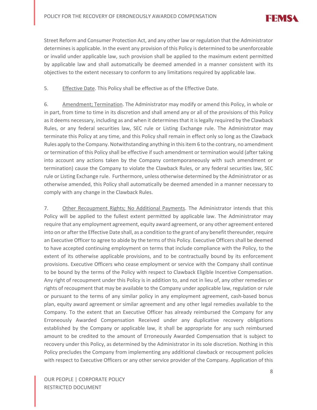 POLICY FOR THE RECOVERY OF ERRONEOUSLY AWARDED COMPENSATION OUR PEOPLE | CORPORATE POLICY RESTRICTED DOCUMENT 8 Street Reform and Consumer Protection Act, and any other law or regulation that the Administrator determines is applicable. In the event any provision of this Policy is determined to be unenforceable or invalid under applicable law, such provision shall be applied to the maximum extent permitted by applicable law and shall automatically be deemed amended in a manner consistent with its objectives to the extent necessary to conform to any limitations required by applicable law. 5. Effective Date. This Policy shall be effective as of the Effective Date. 6. Amendment; Termination. The Administrator may modify or amend this Policy, in whole or in part, from time to time in its discretion and shall amend any or all of the provisions of this Policy as it deems necessary, including as and when it determines that it is legally required by the Clawback Rules, or any federal securities law, SEC rule or Listing Exchange rule. The Administrator may terminate this Policy at any time, and this Policy shall remain in effect only so long as the Clawback Rules apply to the Company. Notwithstanding anything in this item 6 to the contrary, no amendment or termination of this Policy shall be effective if such amendment or termination would (after taking into account any actions taken by the Company contemporaneously with such amendment or termination) cause the Company to violate the Clawback Rules, or any federal securities law, SEC rule or Listing Exchange rule. Furthermore, unless otherwise determined by the Administrator or as otherwise amended, this Policy shall automatically be deemed amended in a manner necessary to comply with any change in the Clawback Rules. 7. Other Recoupment Rights; No Additional Payments. The Administrator intends that this Policy will be applied to the fullest extent permitted by applicable law. The Administrator may require that any employment agreement, equity award agreement, or any other agreement entered into on or after the Effective Date shall, as a condition to the grant of any benefit thereunder, require an Executive Officer to agree to abide by the terms of this Policy. Executive Officers shall be deemed to have accepted continuing employment on terms that include compliance with the Policy, to the extent of its otherwise applicable provisions, and to be contractually bound by its enforcement provisions. Executive Officers who cease employment or service with the Company shall continue to be bound by the terms of the Policy with respect to Clawback Eligible Incentive Compensation. Any right of recoupment under this Policy is in addition to, and not in lieu of, any other remedies or rights of recoupment that may be available to the Company under applicable law, regulation or rule or pursuant to the terms of any similar policy in any employment agreement, cash-based bonus plan, equity award agreement or similar agreement and any other legal remedies available to the Company. To the extent that an Executive Officer has already reimbursed the Company for any Erroneously Awarded Compensation Received under any duplicative recovery obligations established by the Company or applicable law, it shall be appropriate for any such reimbursed amount to be credited to the amount of Erroneously Awarded Compensation that is subject to recovery under this Policy, as determined by the Administrator in its sole discretion. Nothing in this Policy precludes the Company from implementing any additional clawback or recoupment policies with respect to Executive Officers or any other service provider of the Company. Application of this