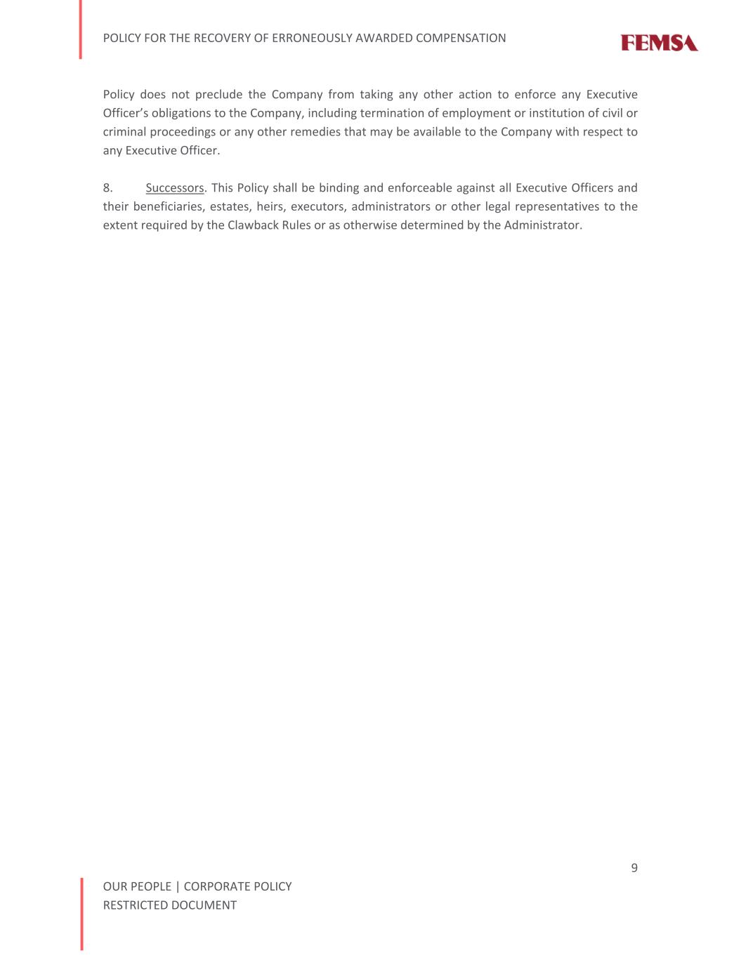 POLICY FOR THE RECOVERY OF ERRONEOUSLY AWARDED COMPENSATION OUR PEOPLE | CORPORATE POLICY RESTRICTED DOCUMENT 9 Policy does not preclude the Company from taking any other action to enforce any Executive Officer’s obligations to the Company, including termination of employment or institution of civil or criminal proceedings or any other remedies that may be available to the Company with respect to any Executive Officer. 8. Successors. This Policy shall be binding and enforceable against all Executive Officers and their beneficiaries, estates, heirs, executors, administrators or other legal representatives to the extent required by the Clawback Rules or as otherwise determined by the Administrator.