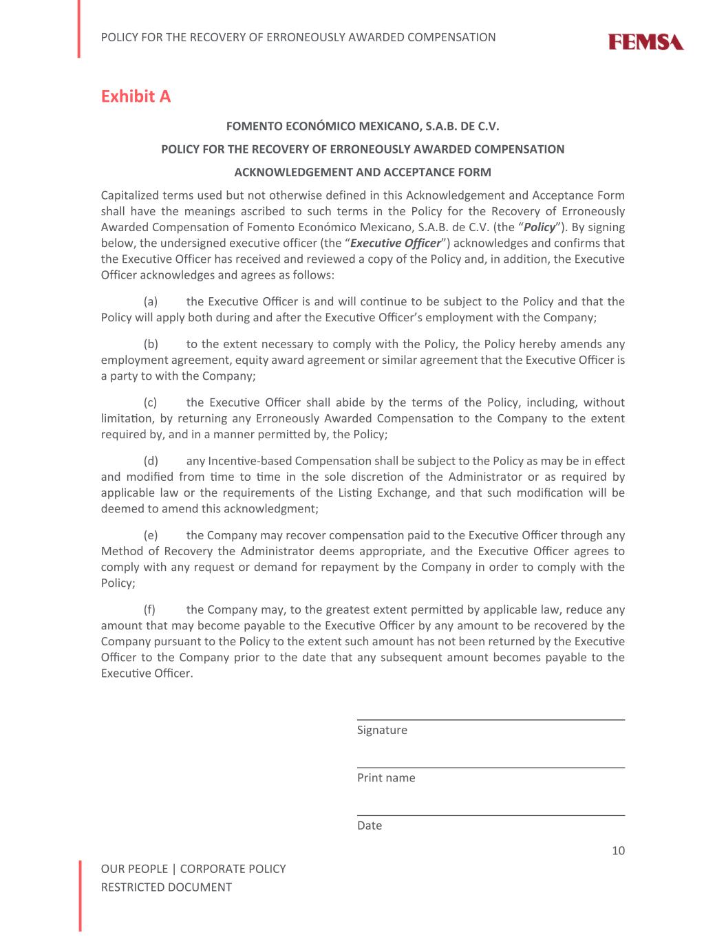 POLICY FOR THE RECOVERY OF ERRONEOUSLY AWARDED COMPENSATION OUR PEOPLE | CORPORATE POLICY RESTRICTED DOCUMENT 10 Exhibit A FOMENTO ECONÓMICO MEXICANO, S.A.B. DE C.V. POLICY FOR THE RECOVERY OF ERRONEOUSLY AWARDED COMPENSATION ACKNOWLEDGEMENT AND ACCEPTANCE FORM Capitalized terms used but not otherwise defined in this Acknowledgement and Acceptance Form shall have the meanings ascribed to such terms in the Policy for the Recovery of Erroneously Awarded Compensation of Fomento Económico Mexicano, S.A.B. de C.V. (the “Policy”). By signing below, the undersigned executive officer (the “Executive Officer”) acknowledges and confirms that the Executive Officer has received and reviewed a copy of the Policy and, in addition, the Executive Officer acknowledges and agrees as follows: (a) the Execu ve Officer is and will con nue to be subject to the Policy and that the Policy will apply both during and a er the Execu ve Officer’s employment with the Company; (b) to the extent necessary to comply with the Policy, the Policy hereby amends any employment agreement, equity award agreement or similar agreement that the Execu ve Officer is a party to with the Company; (c) the Execu ve Officer shall abide by the terms of the Policy, including, without limita on, by returning any Erroneously Awarded Compensa on to the Company to the extent required by, and in a manner permi ed by, the Policy; (d) any Incen ve-based Compensa on shall be subject to the Policy as may be in effect and modified from me to me in the sole discre on of the Administrator or as required by applicable law or the requirements of the Lis ng Exchange, and that such modifica on will be deemed to amend this acknowledgment; (e) the Company may recover compensa on paid to the Execu ve Officer through any Method of Recovery the Administrator deems appropriate, and the Execu ve Officer agrees to comply with any request or demand for repayment by the Company in order to comply with the Policy; (f) the Company may, to the greatest extent permi ed by applicable law, reduce any amount that may become payable to the Execu ve Officer by any amount to be recovered by the Company pursuant to the Policy to the extent such amount has not been returned by the Execu ve Officer to the Company prior to the date that any subsequent amount becomes payable to the Execu ve Officer. Signature Print name Date