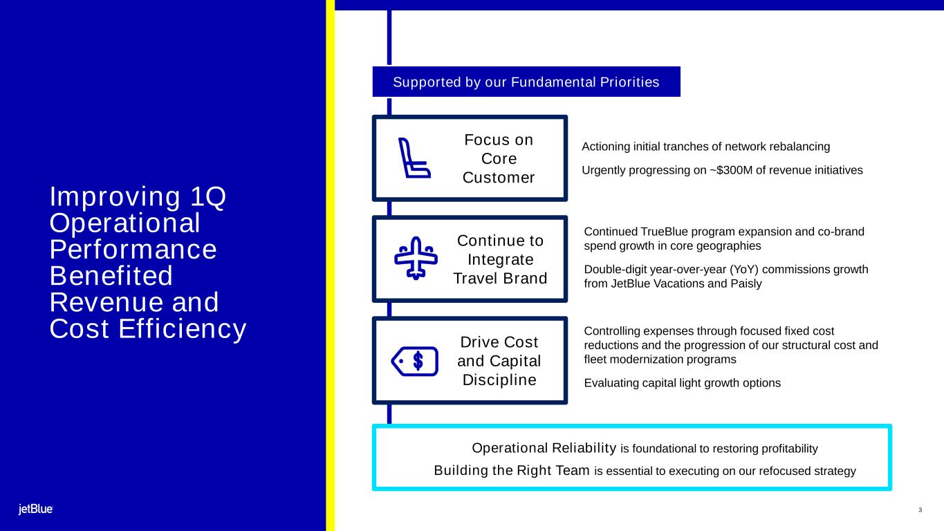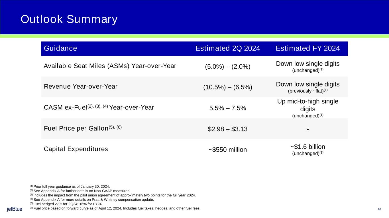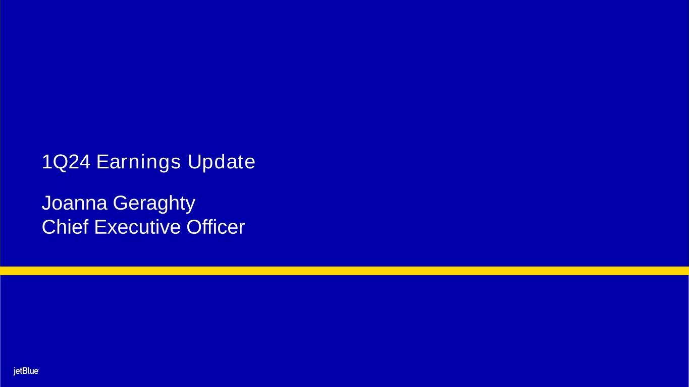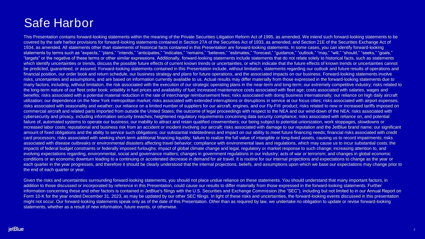 1 Safe Harbor This Presentation contains forward-looking statements within the meaning of the Private Securities Litigation Reform Act of 1995, as amended. We intend such forward-looking statements to be covered by the safe harbor provisions for forward-looking statements contained in Section 27A of the Securities Act of 1933, as amended, and Section 21E of the Securities Exchange Act of 1934, as amended. All statements other than statements of historical facts contained in this Presentation are forward-looking statements. In some cases, you can identify forward-looking statements by terms such as “expects,” “plans,” “intends,” “anticipates,” “indicates,” “remains,” “believes,” “estimates,” “forecast,” “guidance,” “outlook,” “may,” “will,” “should,” “seeks,” “goals,” “targets” or the negative of these terms or other similar expressions. Additionally, forward-looking statements include statements that do not relate solely to historical facts, such as statements which identify uncertainties or trends, discuss the possible future effects of current known trends or uncertainties, or which indicate that the future effects of known trends or uncertainties cannot be predicted, guaranteed, or assured. Forward-looking statements contained in this Presentation include, without limitation, statements regarding our outlook and future results of operations and financial position, our order book and return schedule, our business strategy and plans for future operations, and the associated impacts on our business. Forward-looking statements involve risks, uncertainties and assumptions, and are based on information currently available to us. Actual results may differ materially from those expressed in the forward-looking statements due to many factors, including, without limitation, the risk associated with the execution of our strategic operating plans in the near-term and long-term; our extremely competitive industry; risks related to the long-term nature of our fleet order book; volatility in fuel prices and availability of fuel; increased maintenance costs associated with fleet age; costs associated with salaries, wages and benefits; risks associated with a potential material reduction in the rate of interchange reimbursement fees; risks associated with doing business internationally; our reliance on high daily aircraft utilization; our dependence on the New York metropolitan market; risks associated with extended interruptions or disruptions in service at our focus cities; risks associated with airport expenses; risks associated with seasonality and weather; our reliance on a limited number of suppliers for our aircraft, engines, and our Fly-Fi® product; risks related to new or increased tariffs imposed on commercial aircraft and related parts imported from outside the United States; the outcome of legal proceedings with respect to the NEA and our wind-down of the NEA; risks associated with cybersecurity and privacy, including information security breaches; heightened regulatory requirements concerning data security compliance; risks associated with reliance on, and potential failure of, automated systems to operate our business; our inability to attract and retain qualified crewmembers; our being subject to potential unionization, work stoppages, slowdowns or increased labor costs; reputational and business risk from an accident or incident involving our aircraft; risks associated with damage to our reputation and the JetBlue brand name; our significant amount of fixed obligations and the ability to service such obligations; our substantial indebtedness and impact on our ability to meet future financing needs; financial risks associated with credit card processors; risks associated with seeking short-term additional financing liquidity; failure to realize the full value of intangible or long-lived assets, causing us to record impairments; risks associated with disease outbreaks or environmental disasters affecting travel behavior; compliance with environmental laws and regulations, which may cause us to incur substantial costs; the impacts of federal budget constraints or federally imposed furloughs; impact of global climate change and legal, regulatory or market response to such change; increasing attention to, and evolving expectations regarding, environmental, social and governance matters; changes in government regulations in our industry; acts of war or terrorism; and changes in global economic conditions or an economic downturn leading to a continuing or accelerated decrease in demand for air travel. It is routine for our internal projections and expectations to change as the year or each quarter in the year progresses, and therefore it should be clearly understood that the internal projections, beliefs, and assumptions upon which we base our expectations may change prior to the end of each quarter or year. Given the risks and uncertainties surrounding forward-looking statements, you should not place undue reliance on these statements. You should understand that many important factors, in addition to those discussed or incorporated by reference in this Presentation, could cause our results to differ materially from those expressed in the forward-looking statements. Further information concerning these and other factors is contained in JetBlue's filings with the U.S. Securities and Exchange Commission (the “SEC”), including but not limited to in our Annual Report on Form 10-K for the year ended December 31, 2023, as may be updated by our other SEC filings. In light of these risks and uncertainties, the forward-looking events discussed in this presentation might not occur. Our forward-looking statements speak only as of the date of this Presentation. Other than as required by law, we undertake no obligation to update or revise forward-looking statements, whether as a result of new information, future events, or otherwise.