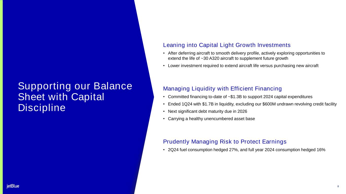 7 (1) Revised Q1 guidance on March 12, 2024 of 8.5% - 9.5% YoY for CASM ex-Fuel. Initial Q1 guidance on January 30, 2024 of 9% to 11%. (2) Operating expense per available seat mile, excluding fuel, other non-airline operating expenses and special items (“CASM ex-Fuel”); refer to reconciliations of non-GAAP financial measures in Appendix A. (3) See Appendix A for more details on Pratt & Whitney compensation update. 1Q24 Guidance 1Q24 Actual 2Q24 Guidance FY24 Guidance 7.1% 5.5% to 7.5% CASM ex-Fuel(1), (2), (3) YoY Growth Continued Controllable Cost Execution 1Q24 Cost Performance Better than Expected • Strong completion factor driving cost efficiency across operation • Benefited from timing shift of expenses into the remainder of the year, smoothing costs throughout the year Cost Cutting Programs in Place Designed to Mitigate Headwinds • $175M - $200M structural cost program achieved ~$100M in savings since program start • More A220s in service than E190s by the end of April, reflecting our fleet modernization efforts • Fleet modernization program achieved $70M in total program savings; increased expected size of program from $75M to $100M • Successfully implemented fixed cost reductions, a 0.5 point benefit to full year CASM ex-Fuel growth, included in full-year cost guidance Effectively Managing our Costs during Capacity Deceleration • Pratt & Whitney compensation accounting update driving incremental pressure on full-year CASM-ex Fuel guidance • Actively exploring further cost savings opportunities in productivity, maintenance spend optimization and technology-enabled efficiencies Up Mid-to- High Single Digits 8.5% - 9.5% (2.7%) (5.0%) – (2.0%) Down low single digits YoY ASM Growth